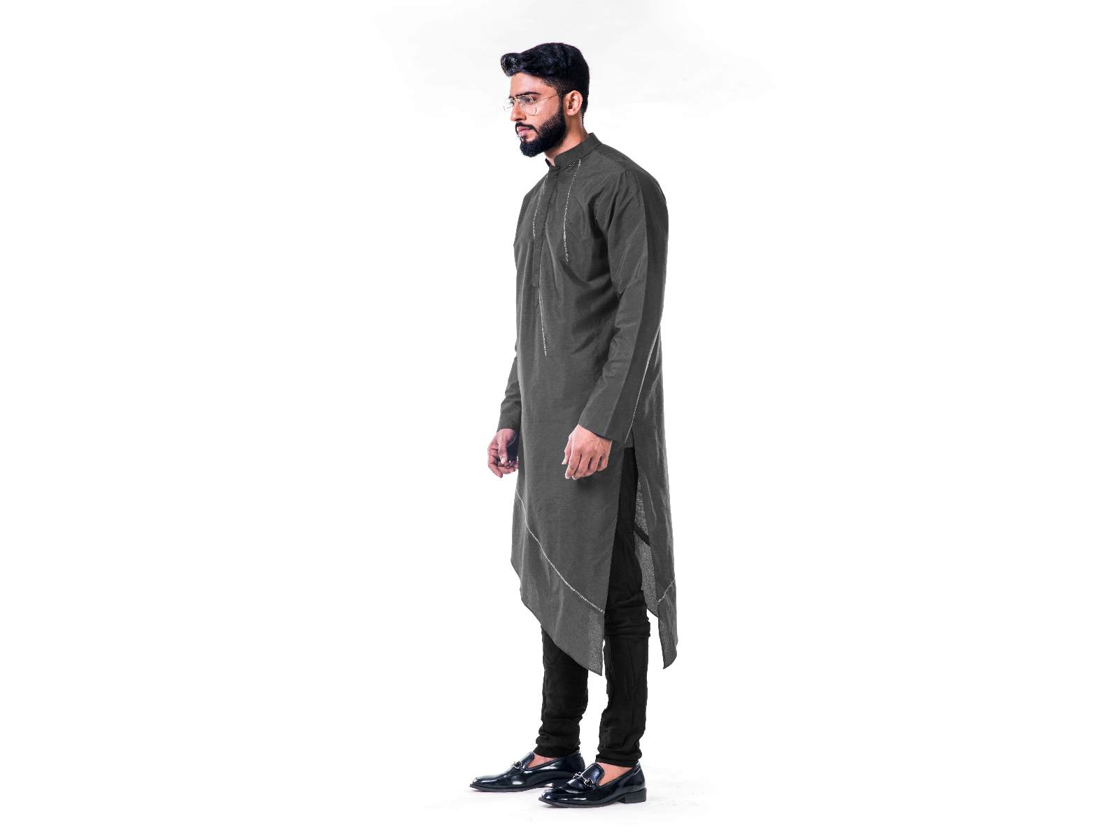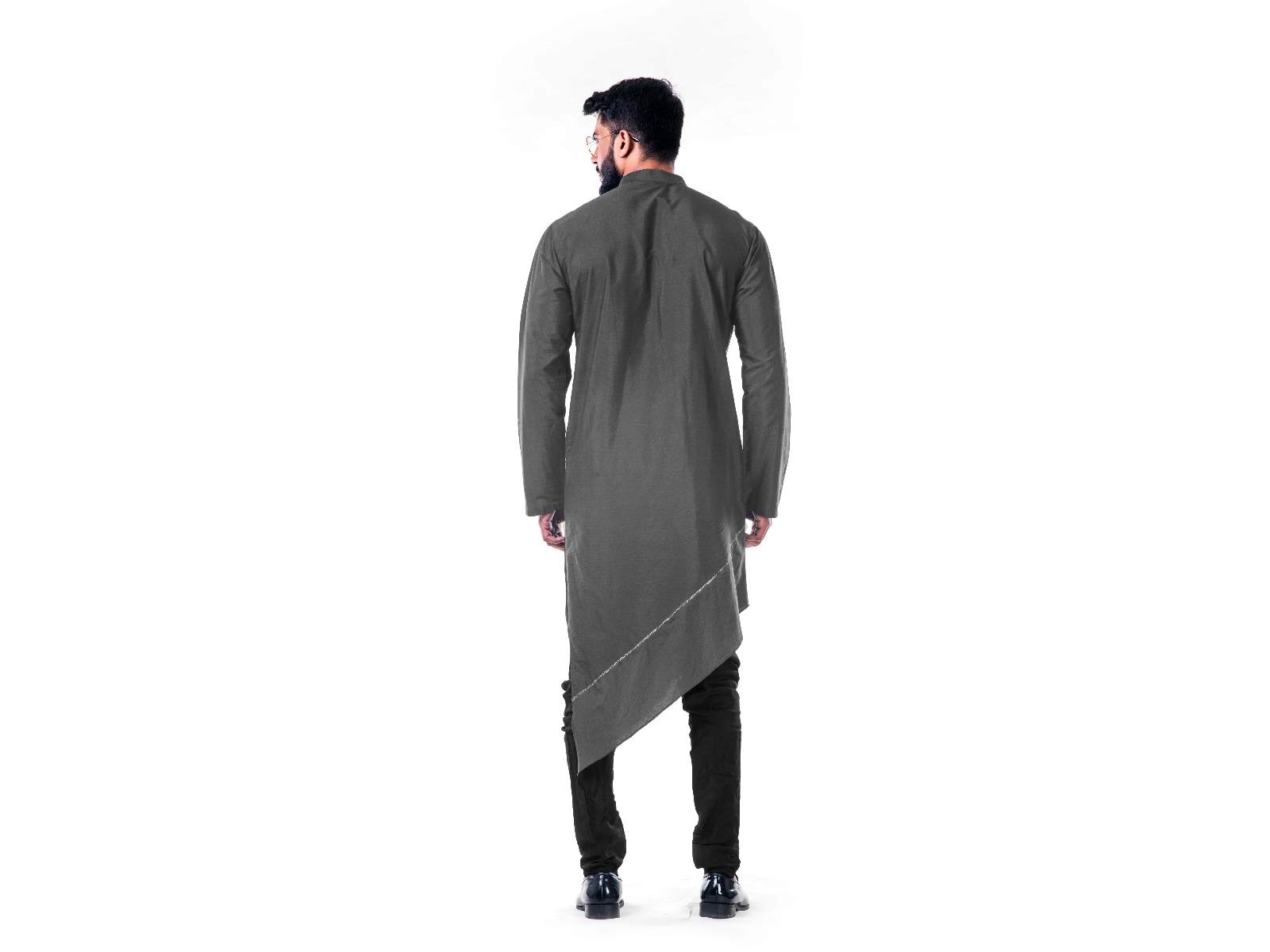 Featuring a Grey Asymmetrical Hemline Embroidered kurta Set.The kurta has a asymmetrical hemline along with abstract kasab embroidery work. FABRIC SPECIFICATION: The kurta and the churidar are made up of cotton silk fabric. WASH CARE INSTRUCTIONS: Dry clean only.Steam iron only.Do not wash(Possibility of slight colour variation). This piece consists of a kurta and churidar pants.Length : 47 PRODUCT CODE: GKA2531