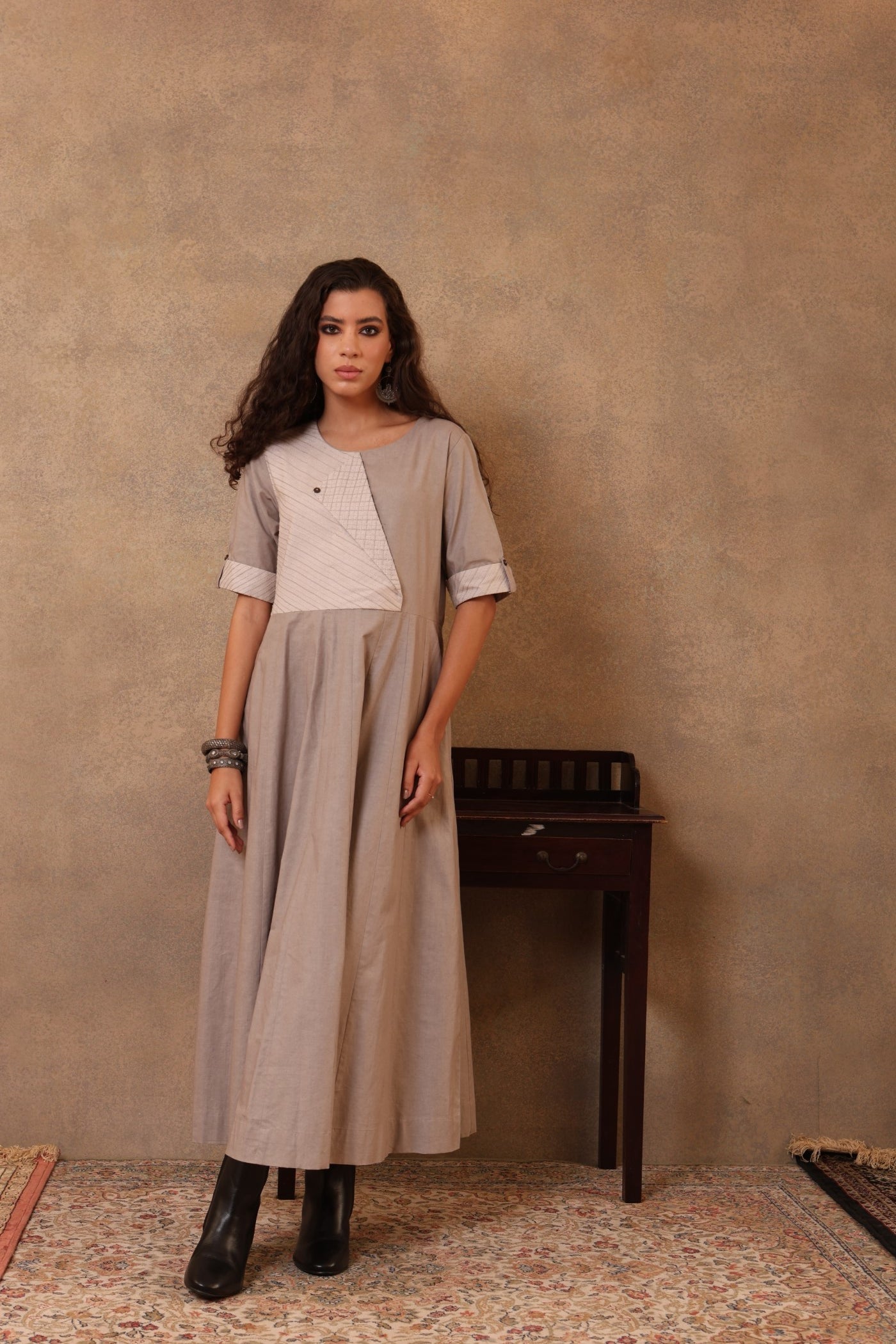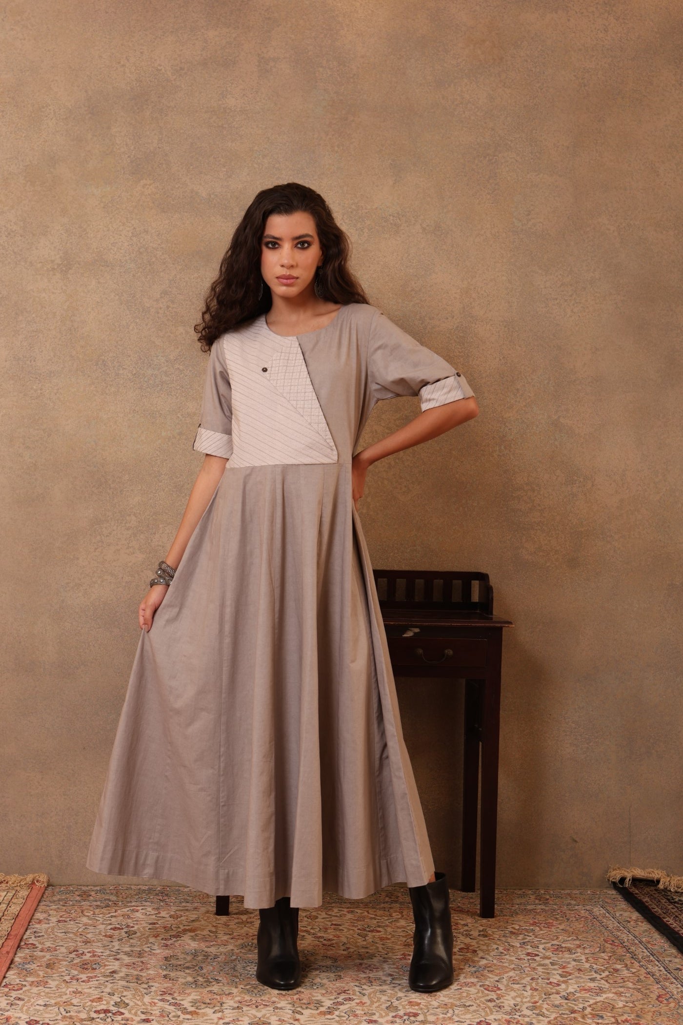 Grey & Light-Grey Pure Linen-Cotton Long Dress With Threadwork Detail & Upturned Cuffs