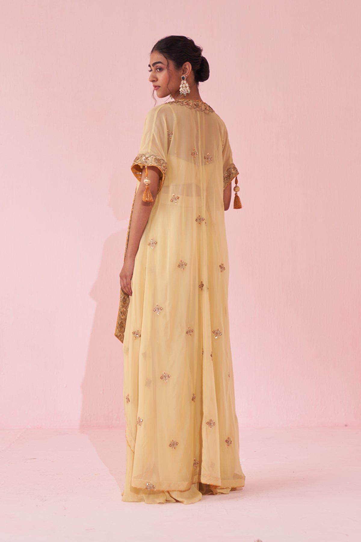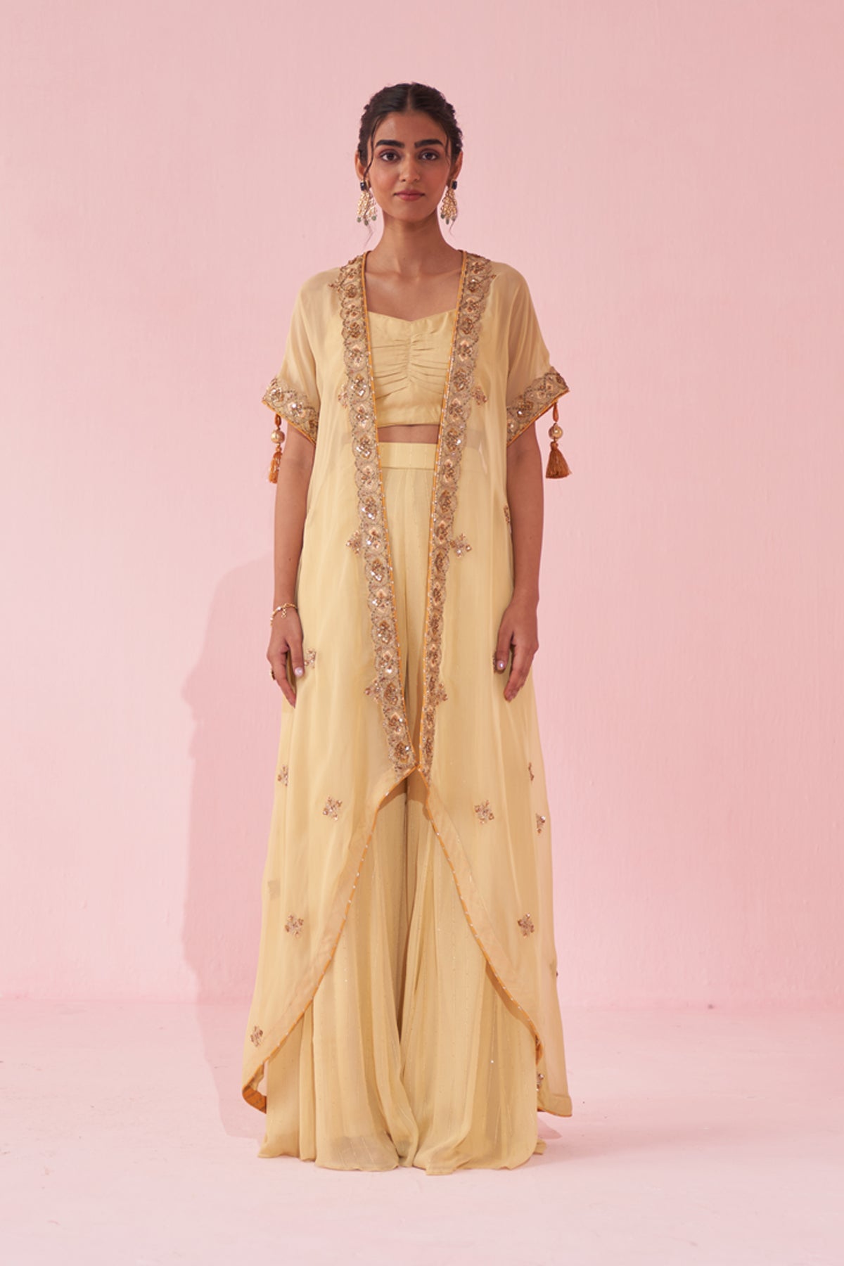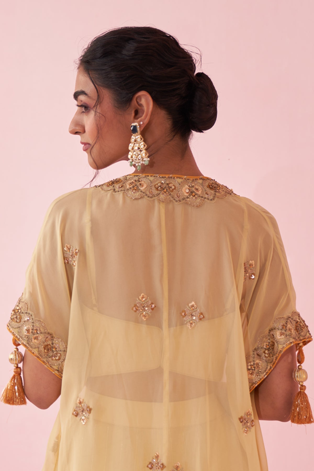 A yellow outfit featuring a flowing cape paired with sharara pants. The look is completed with an embroidered overlay and tasseled sleeves, offering a graceful and modern vibe for festive occasions.
