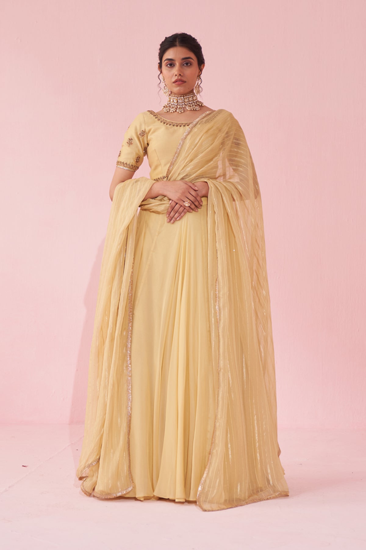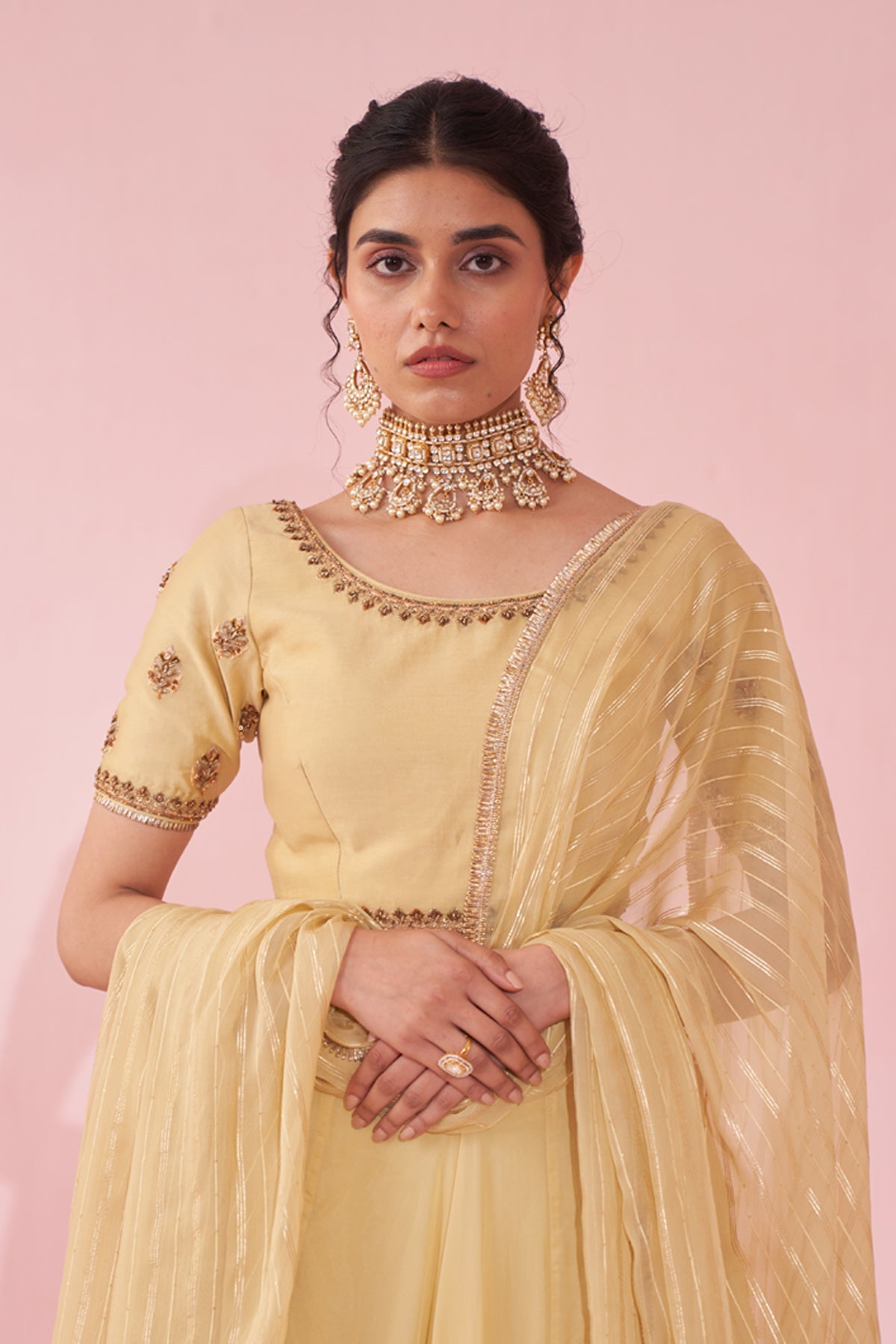 The GULKAND Yellow Lehenga Set features a delicately embroidered choli with intricate detailing on the sleeves and neck, paired with a flowy skirt. The ensemble is completed with a sheer dupatta adorned with intricate border detailing, making it perfect for festive occasions and cultural celebrations.