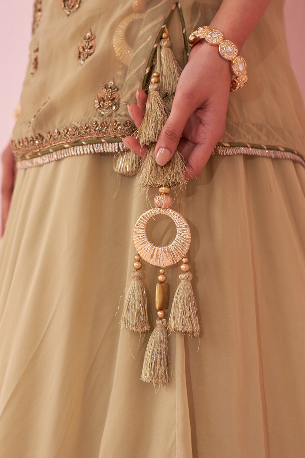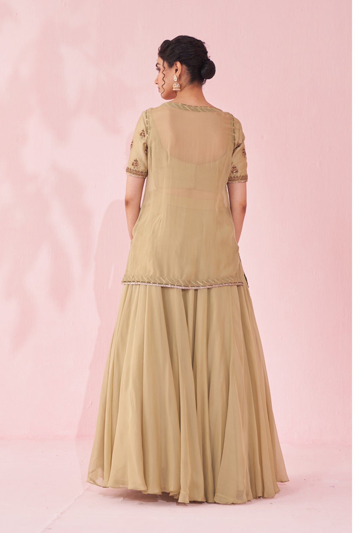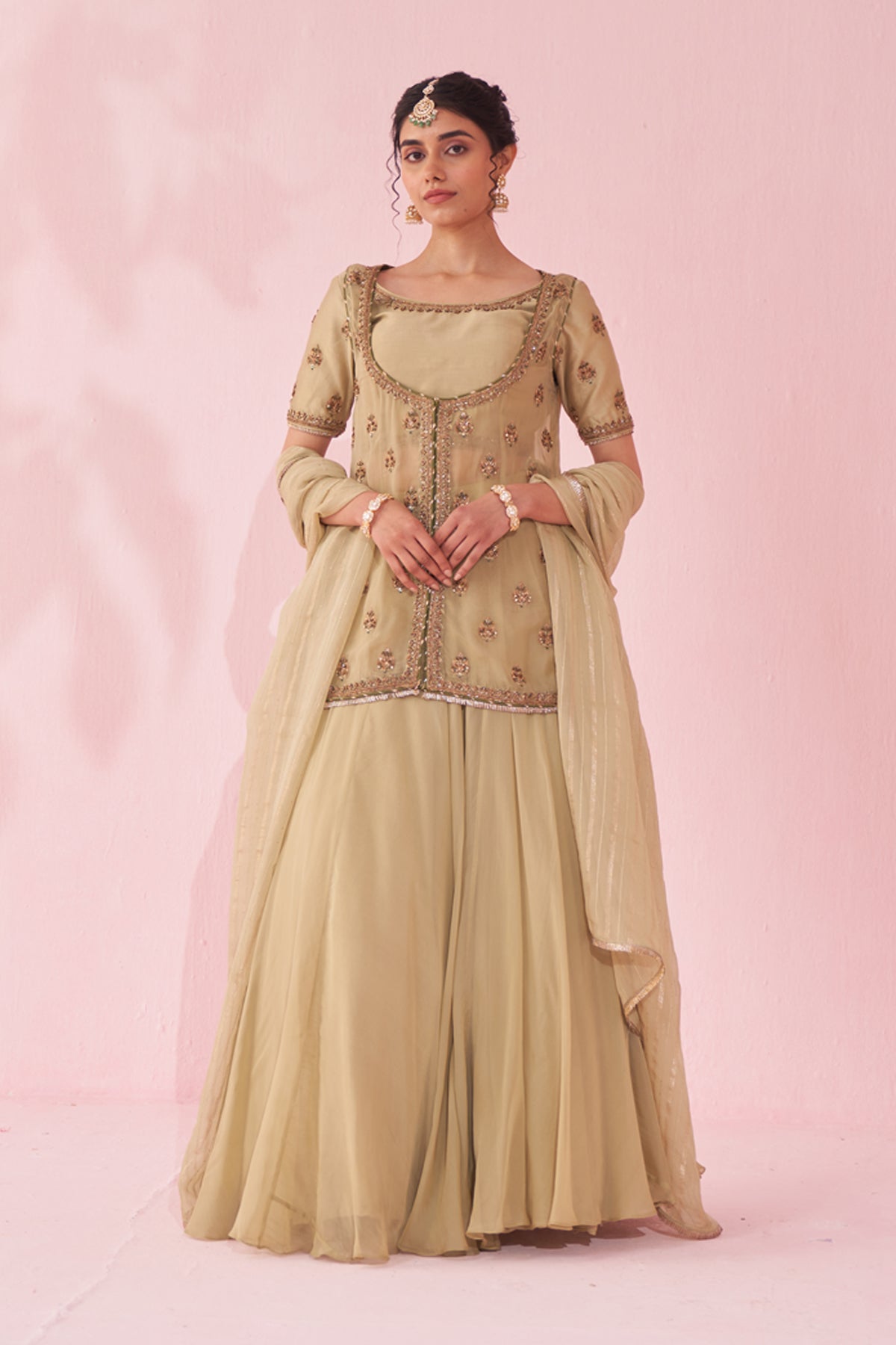 The GULMOHAR Green Lehenga Set features a delicately embroidered jacket and choli, with intricate embroidery on the sleeves and neck, paired with a flowy skirt. The ensemble is completed with a sheer dupatta adorned with intricate border detailing, making it perfect for festive occasions and cultural celebrations.