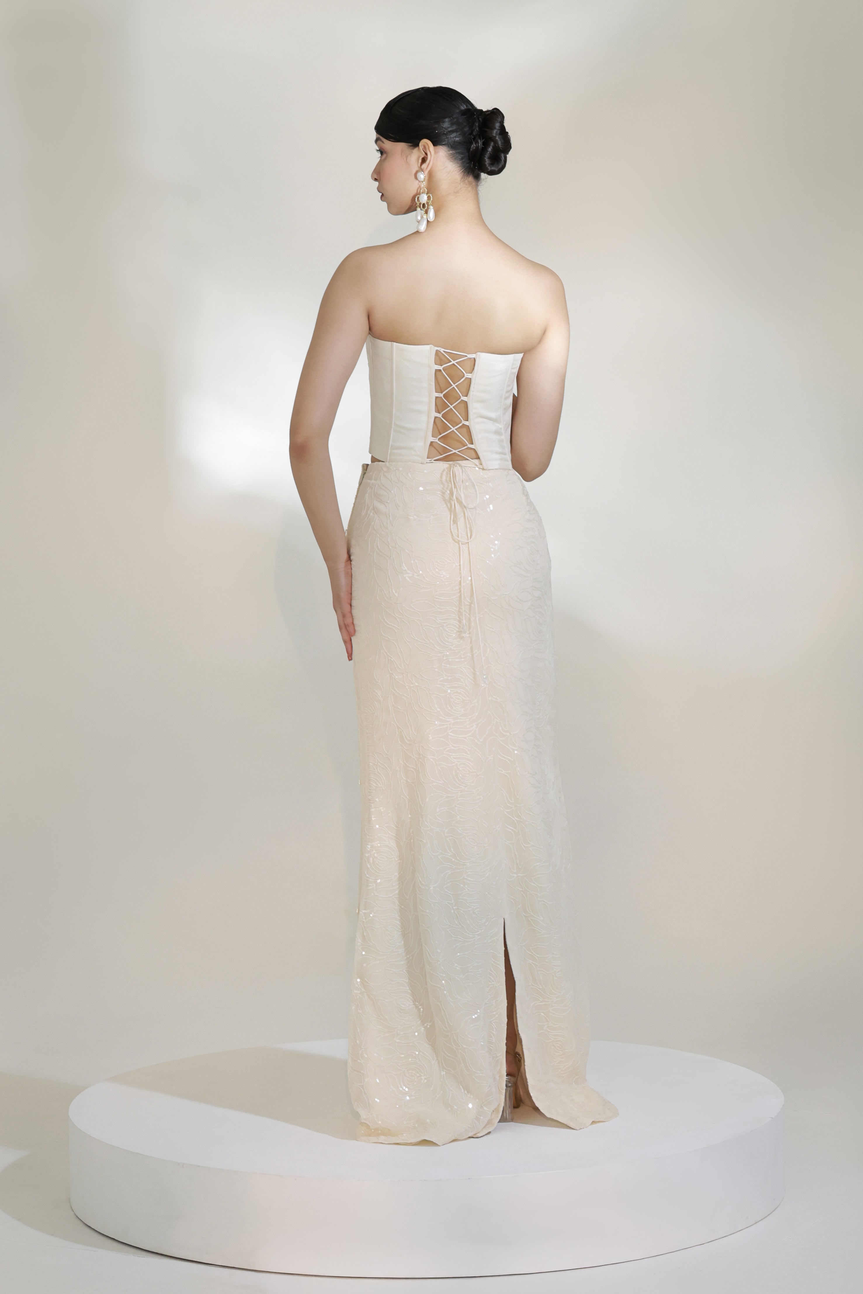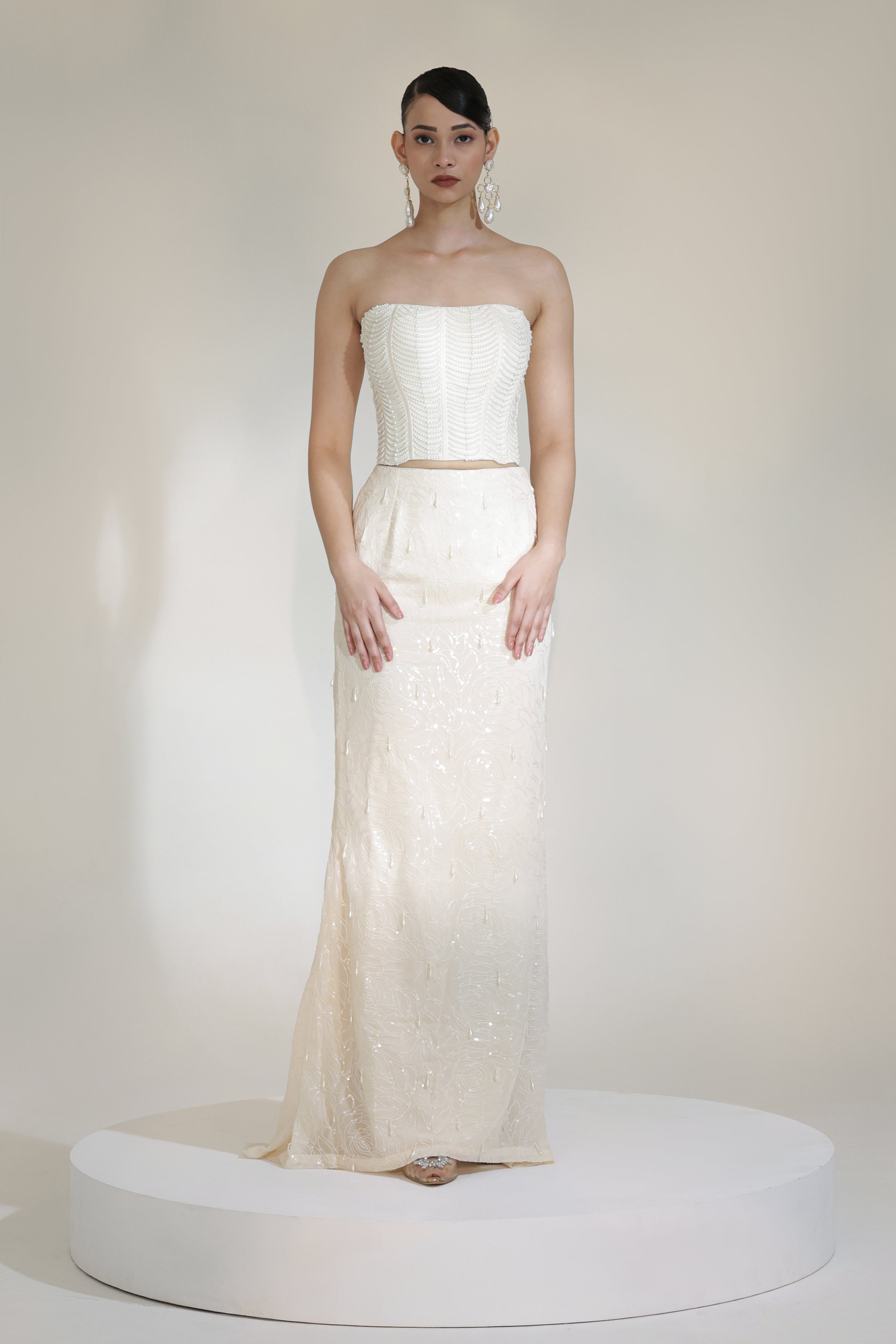 An ode to timeless pearl artistry with a playful modern edge. The hand-embellished pearl corset, structured with precision, pairs with an A-line skirt that features delicate self-embroidery and cascading pearl tassels.