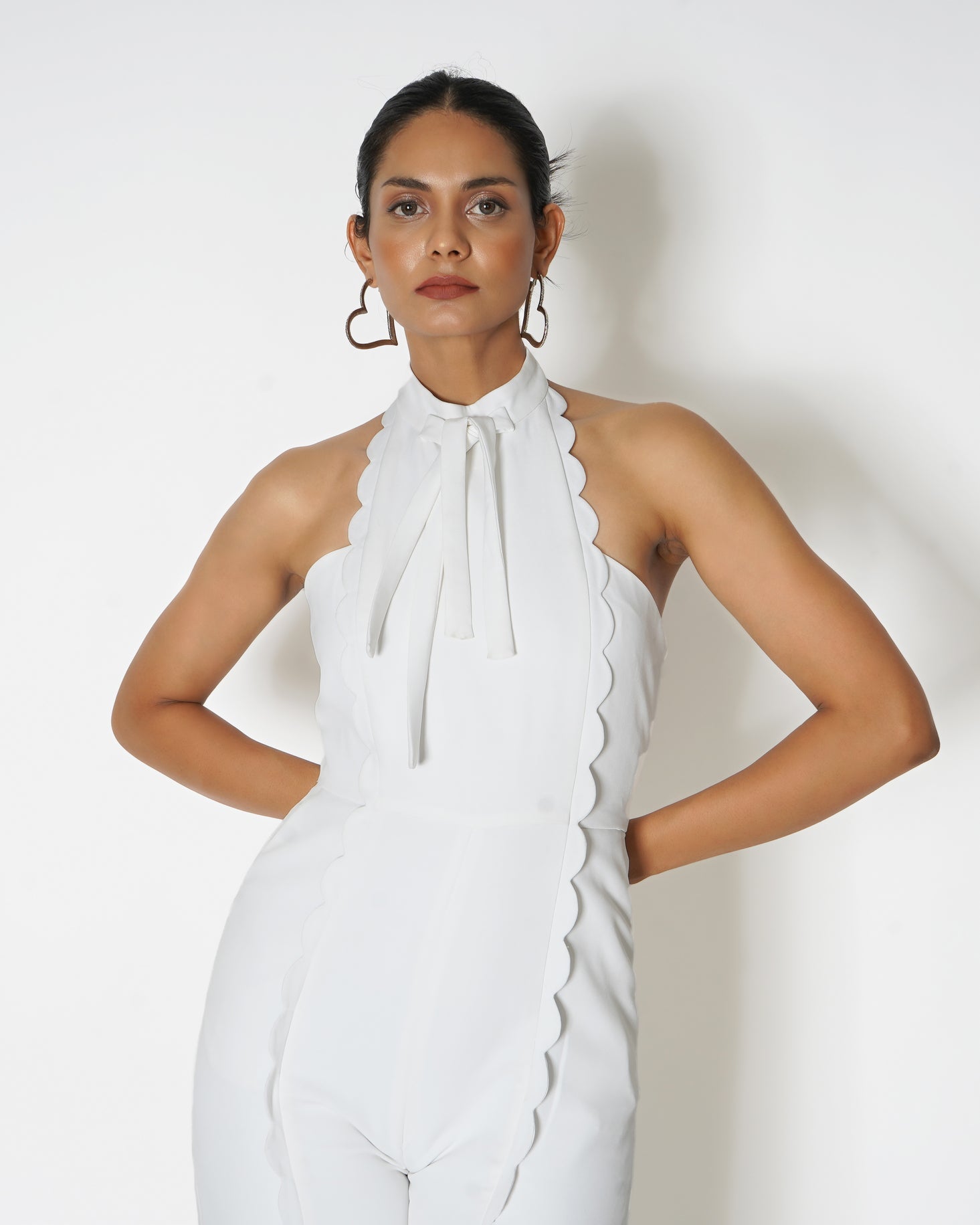 Halter-neck wide legged jumpsuit with scalloped detailing. Tie detail on the neck. Side pockets. Zip closure on the back. Lined.