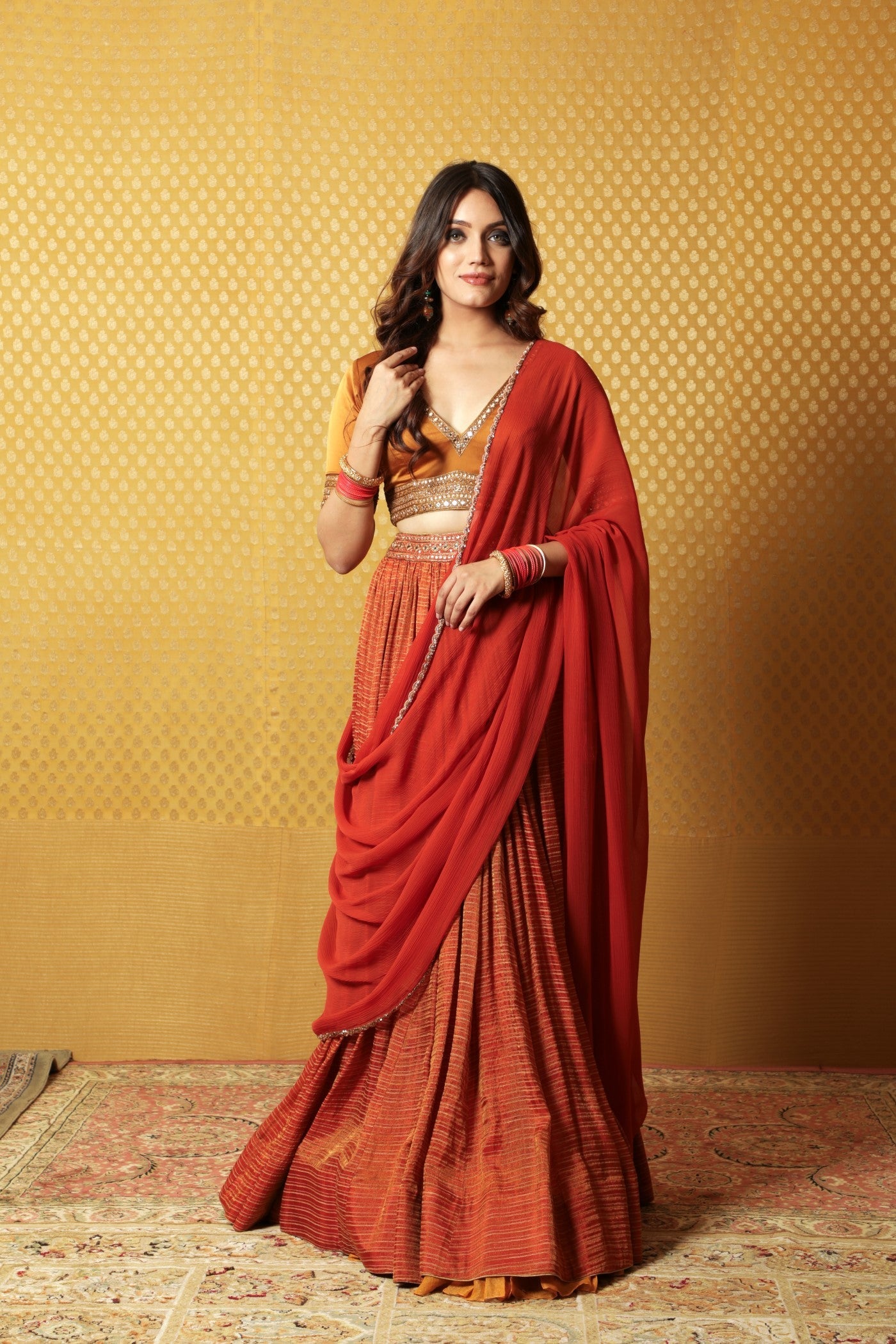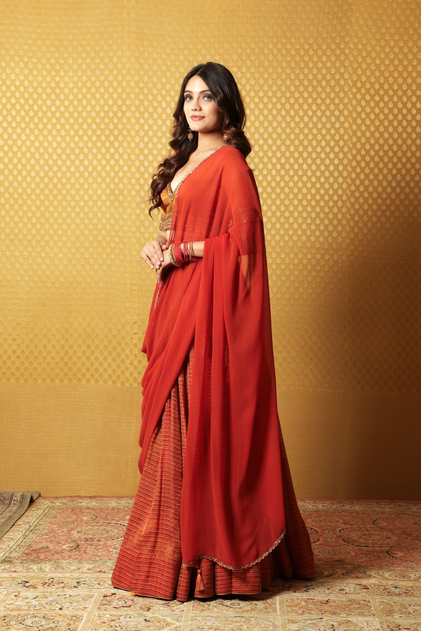 Lehenga: Pure Metallic Georgette Silk With Metallic Stripes