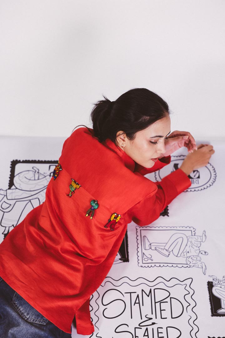|| this linen satin shirt hides its wild side at the back. featuring 3D hand-embroidered, stamp funny figures swinging off the back yoke. on the front? it's business as usual with a sharp collar that finishes the piece.