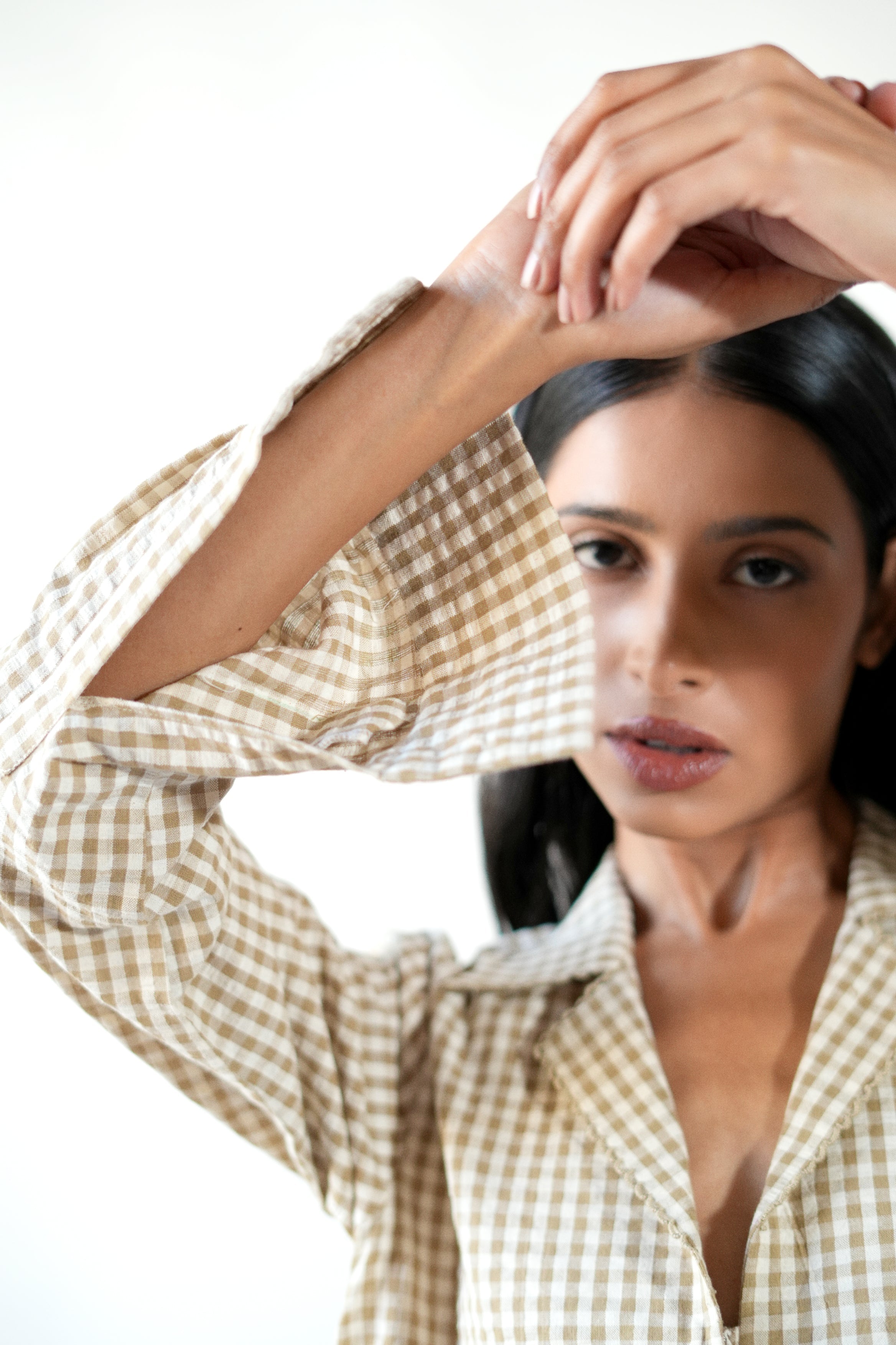 This outfit blends sophisticated details with a touch of nature's charm, perfect for any occasion. Transform your look with a long, collared shirt featuring elegant peony embroidery on one side, paired with solid-colored trousers.
