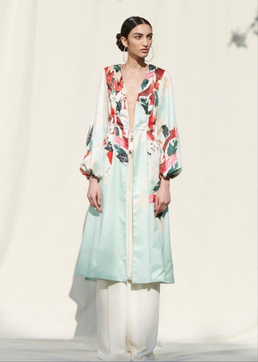 Heavy Crepe Satin Jacket With Placement Prints Paired With A Satin Pallazo