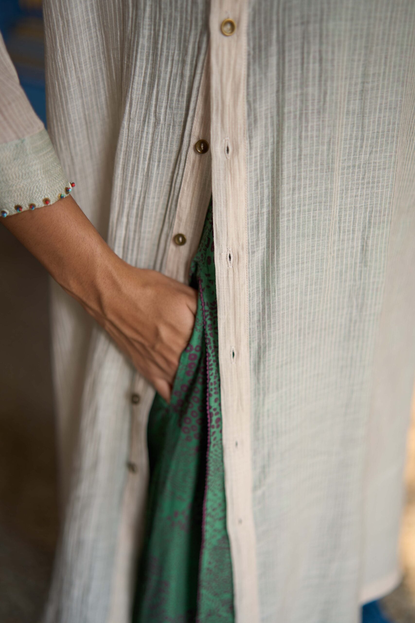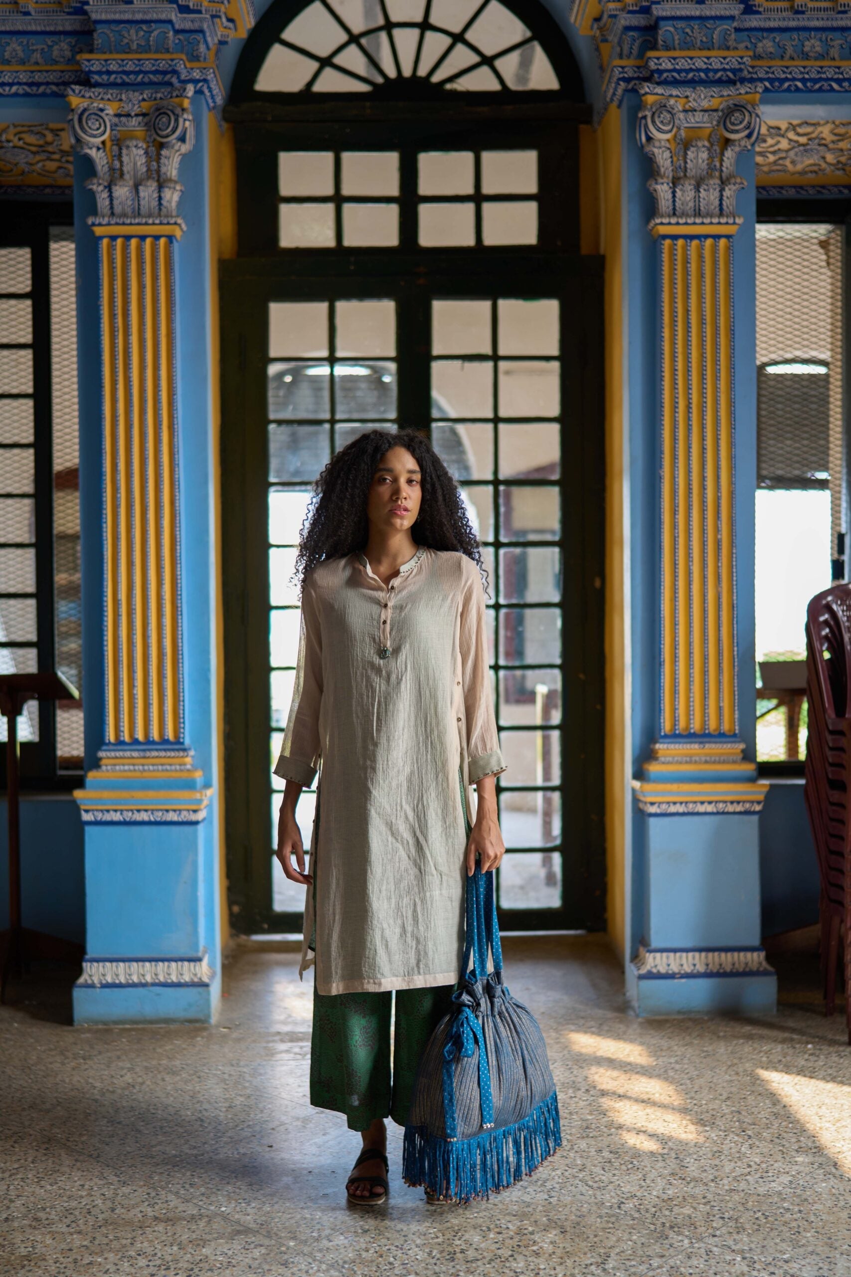 The HERA Kurta by Swatti Kapoor, Cut in handwoven Chanderi with subtle self-stripes, this design captures elegance through its hi-lo silhouette, fluid drape, and thoughtful detailing. The kurta is layered with a deep green block-printed contrast inner, which adds depth and richness to the ivory base. Finished with hand-done embellishments, HERA resonates with understated luxury—perfect for the woman who appreciates heritage artistry reimagined for contemporary living.