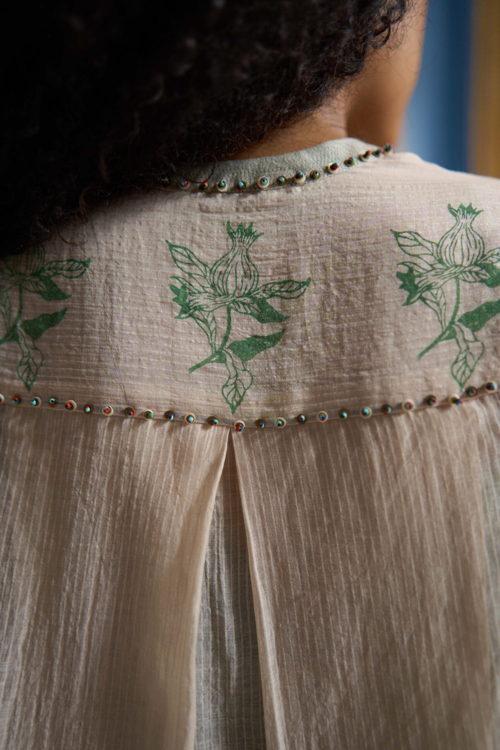 - Details: Self-stripe ivory Chanderi with handcrafted embellishments, paired with a rich green printed underlay