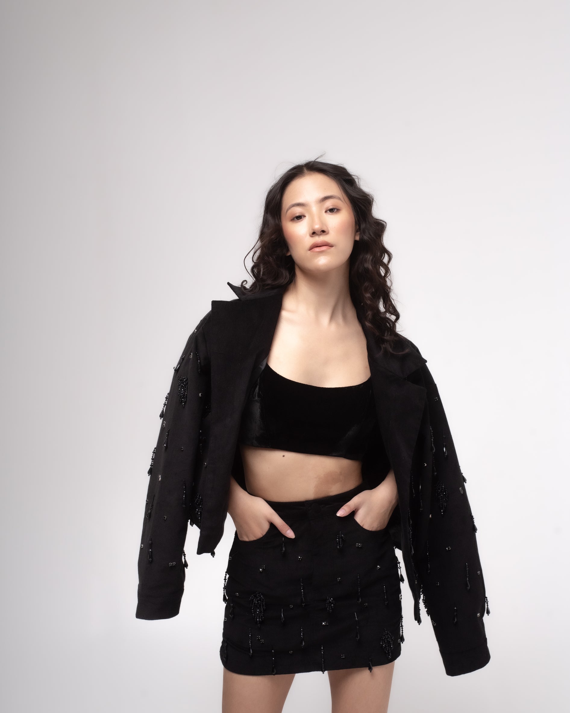 The skirt highlights black beaded drops and rhinestone embroidery all over the front.