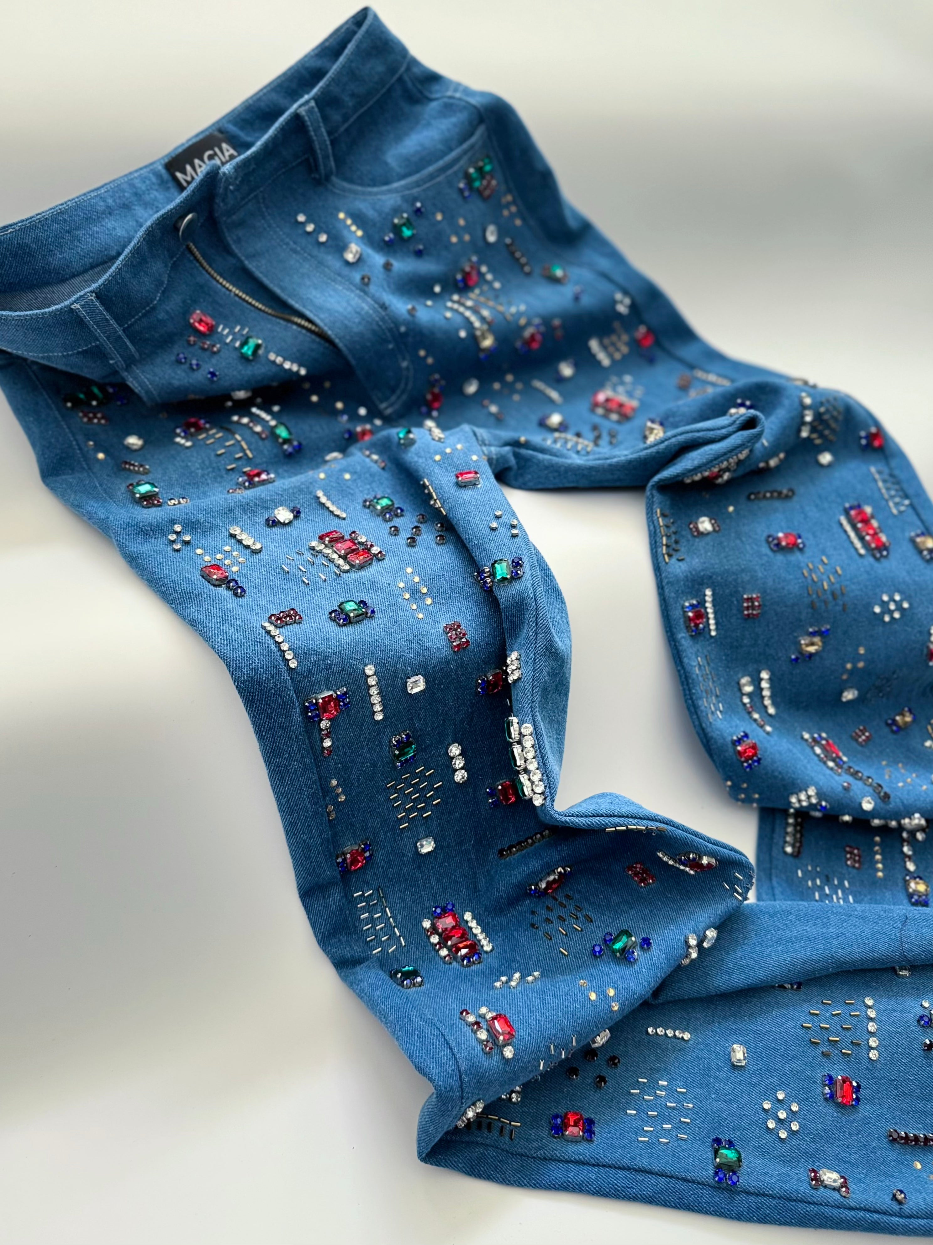 The statement jeans feature multi-colour embellishments hand-embroidered all over the front.