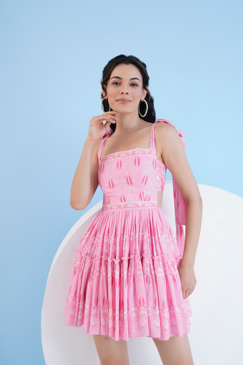 Featuring ice fly printed gathered short dress in cotton slub with knotted straps and embroidered cuffs.