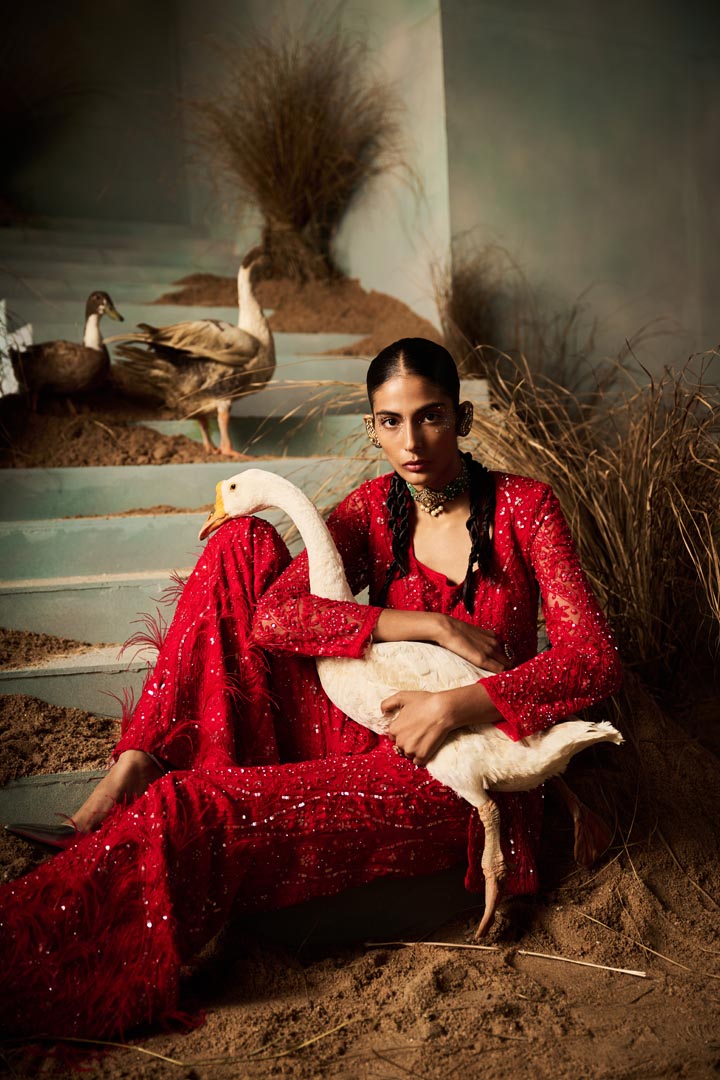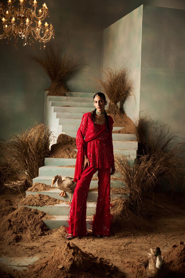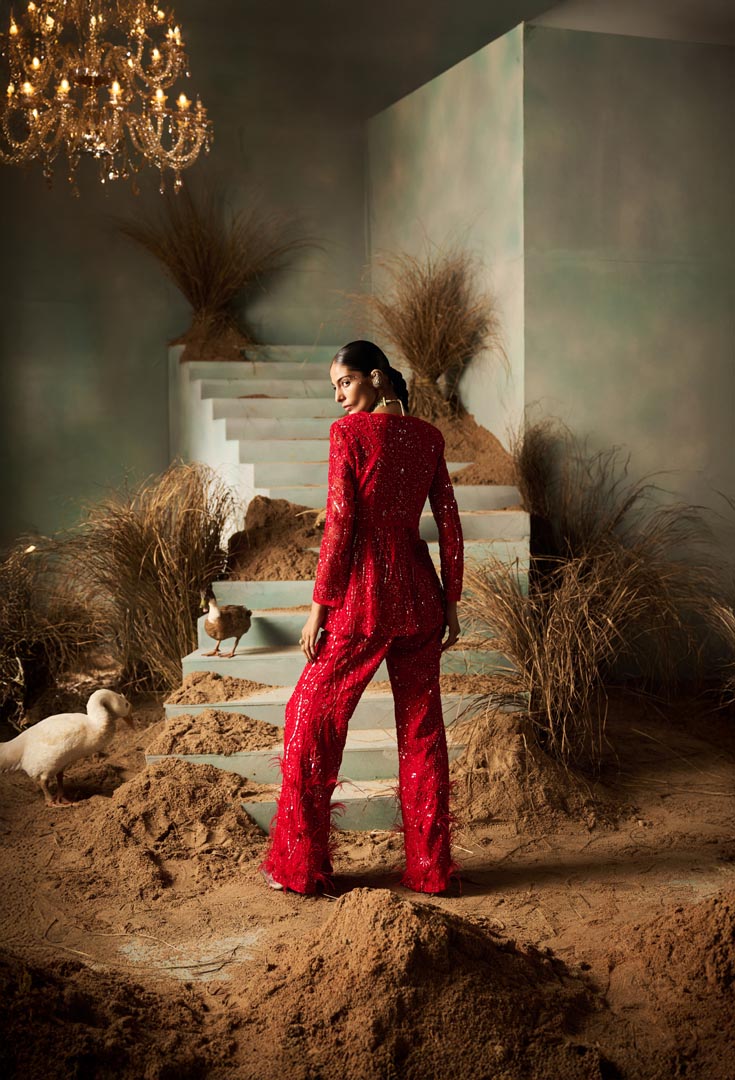 This peplum silhouette hugs you in all the right places and then flares out like its got somewhere glamourous to be with. This tonal thread embroidery is highlighted with sequins and cutdana. The feathers on pant make it power-play.