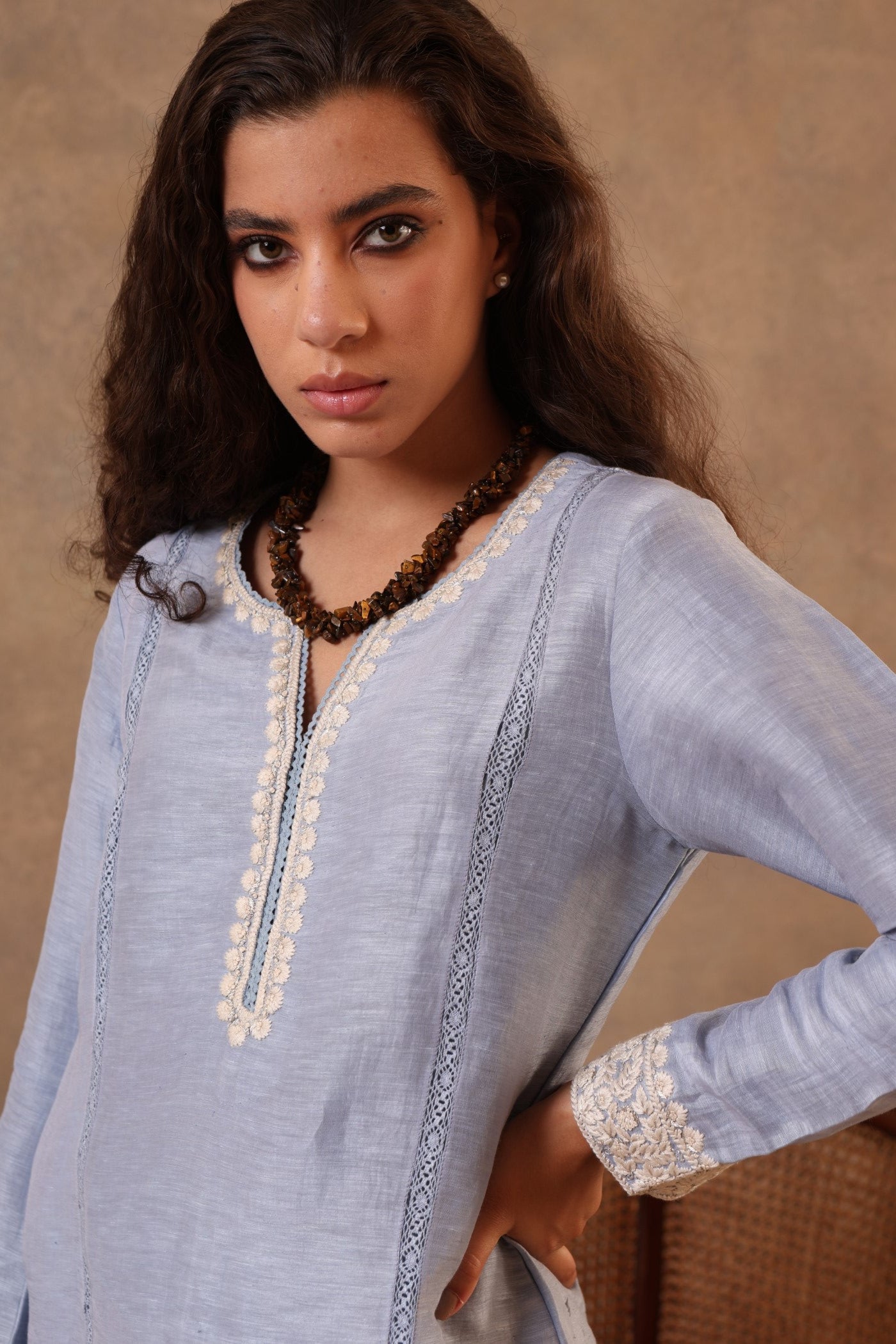 Indigo-Blue Hand-Embroidered Pure Linen-Silk Short Blouse