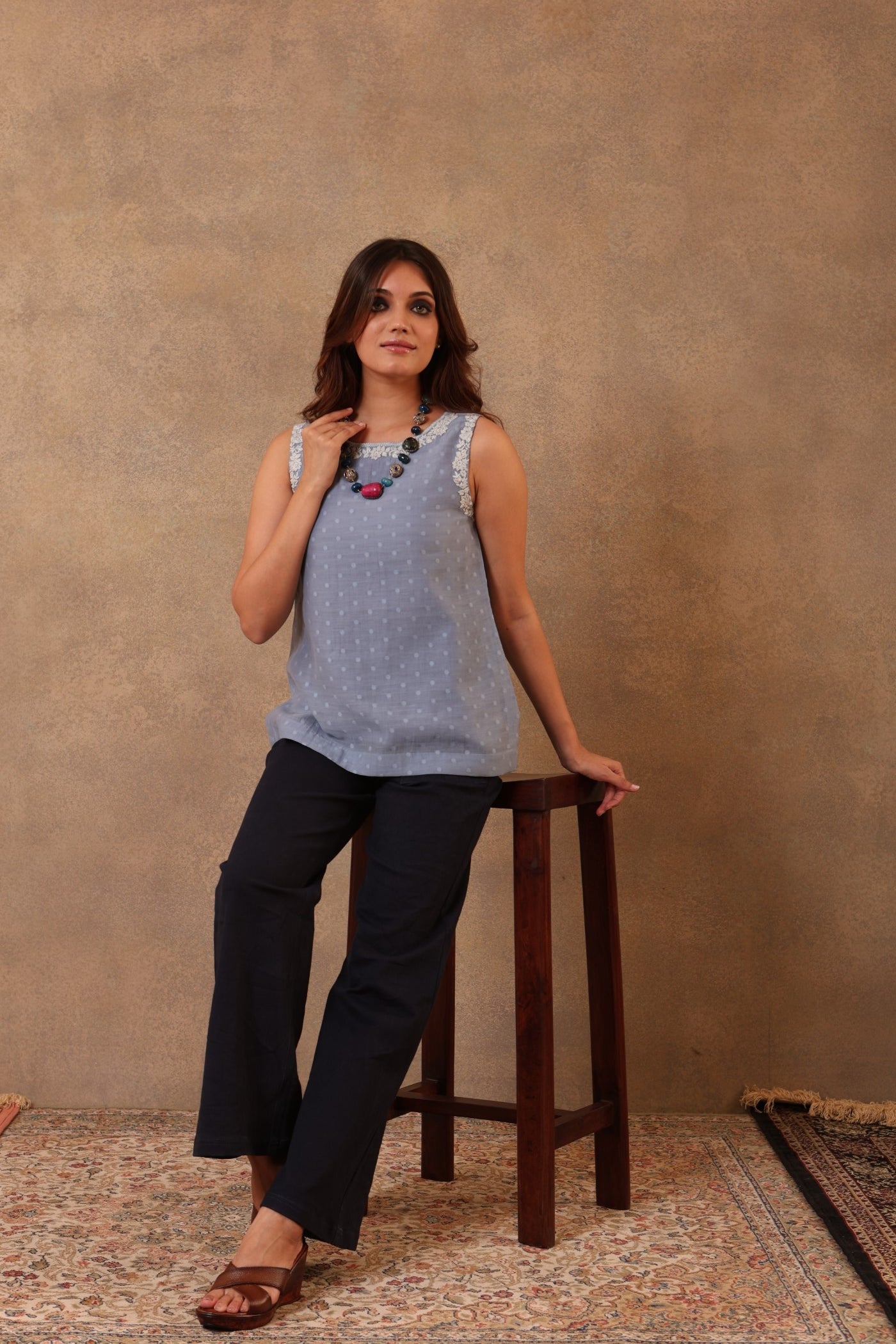 Indigo-Blue Hand-Embroidered Pure Silk-Cotton (Polka Dots) Sleeveless Short Blouse