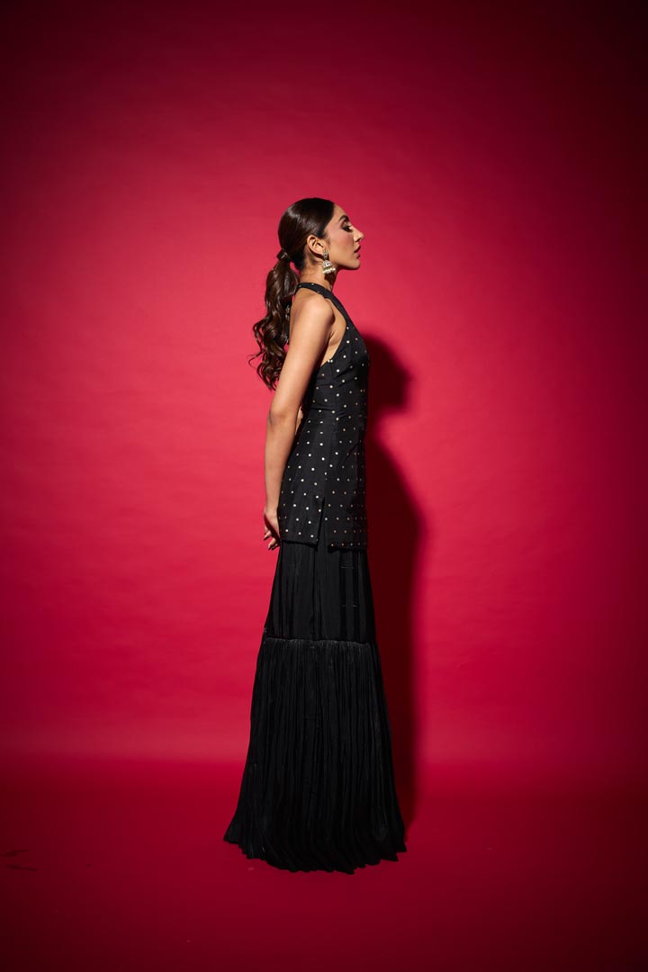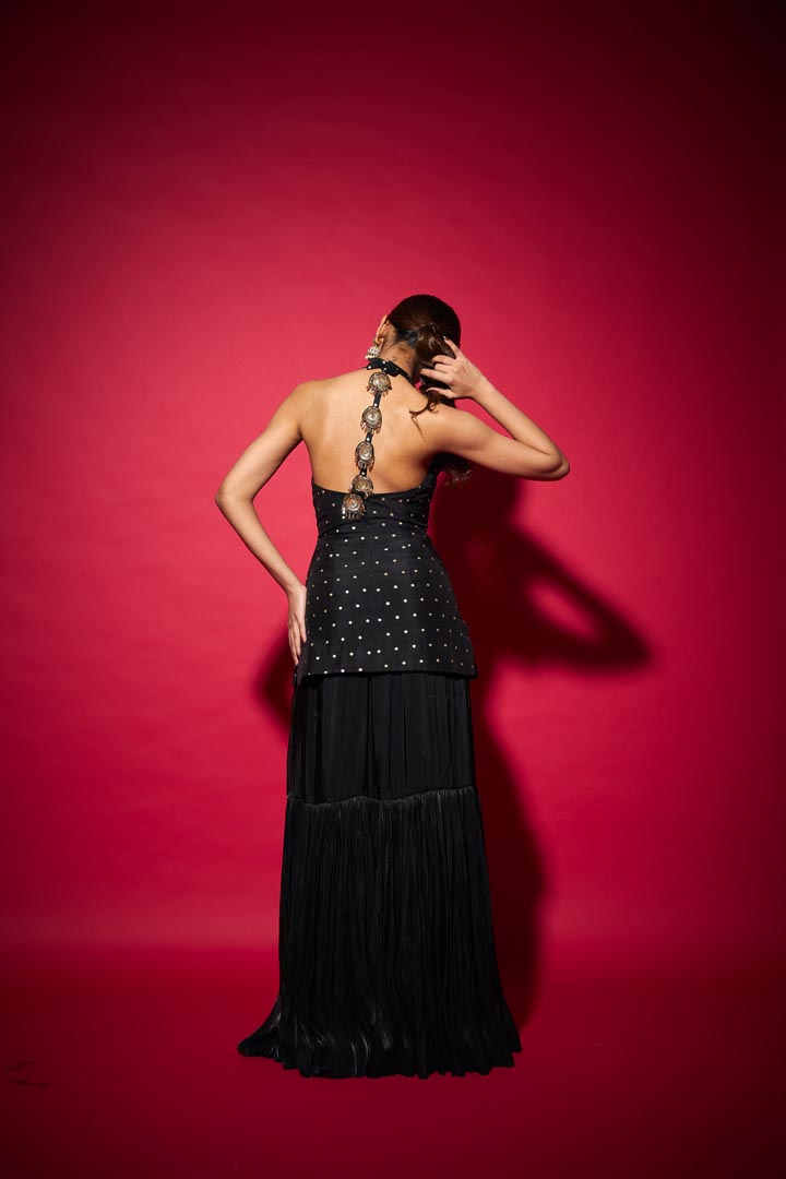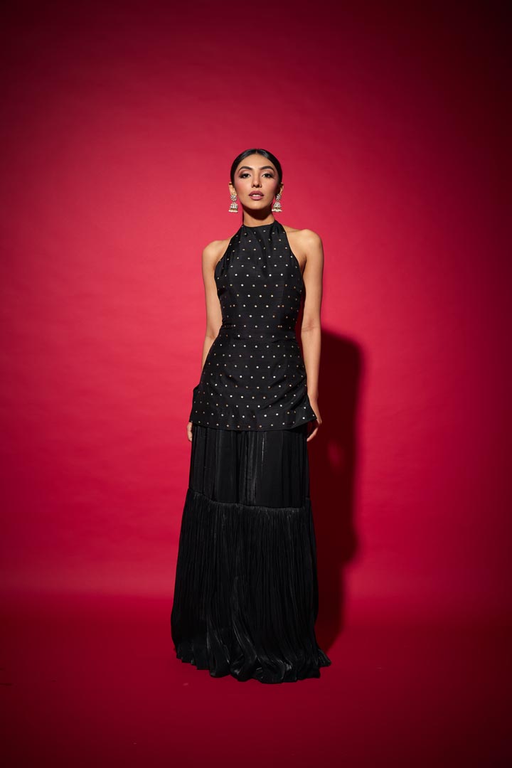 Meet Ishi, a bold fusion of tradition and allure. The intricate brocade top embraces timeless craftsmanship, while the ruched satin crepe skirt sculpts a fluid, modern silhouette. Delicate hand-embellished brooches on the back string bring a hint of sparkle and surprise, perfect for those who love their festive looks with a dash of red-carpet glamour.