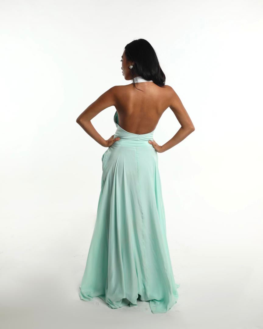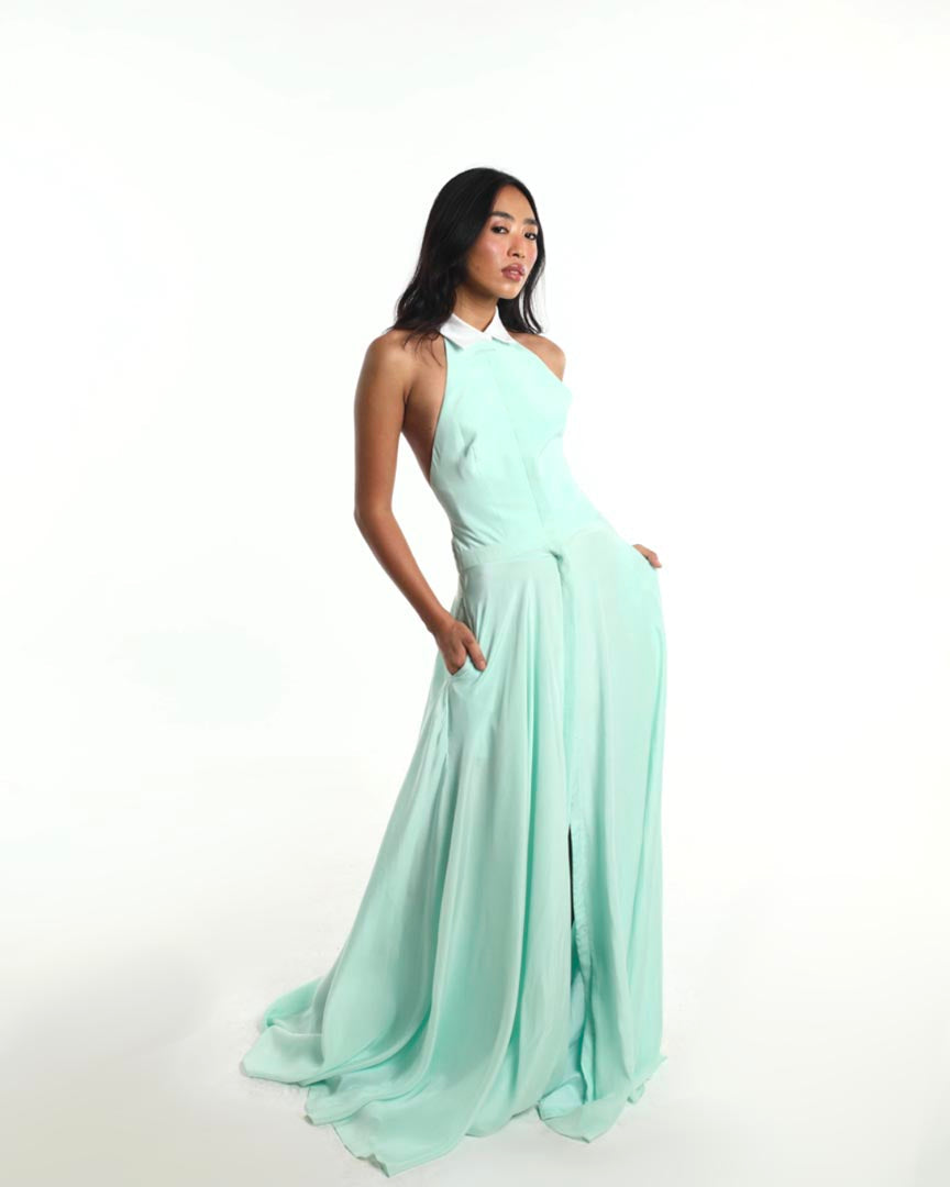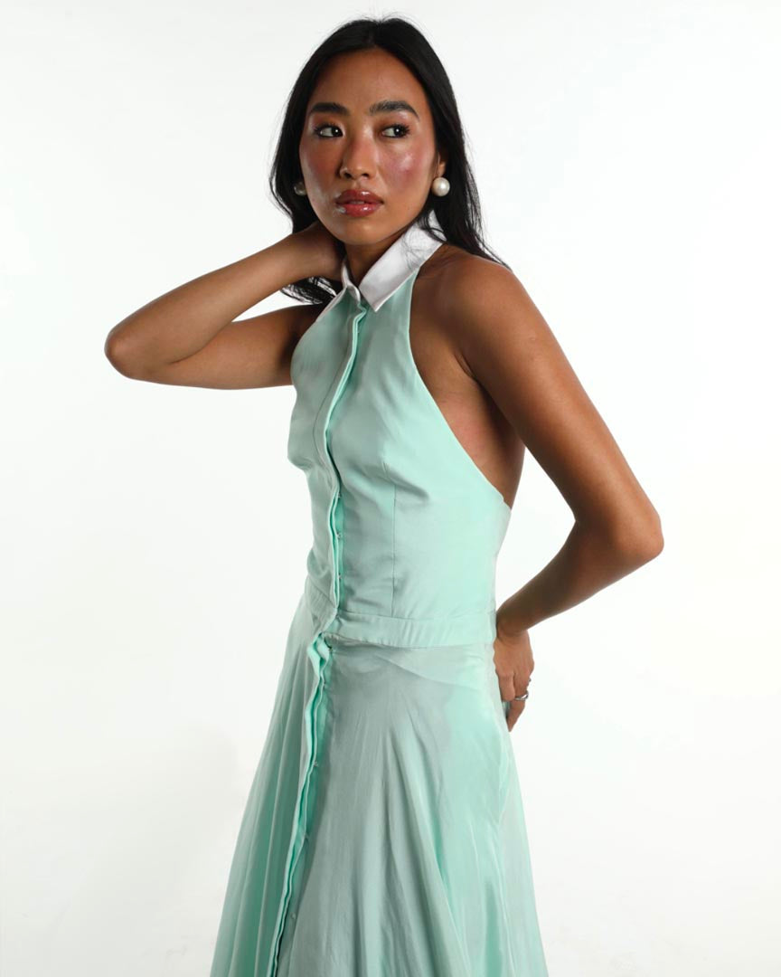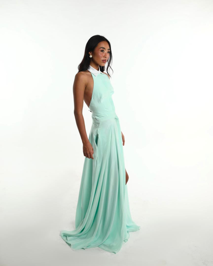 This dress is a refreshing blend of modern tailoring and effortless grace. Featuring a structured halter neckline with a crisp white collar detail, it brings a playful twist to classic elegance. The soft, fluid fabric flows into a dramatic front slit, giving it just the right touch of allure and movement. A statement piece for garden parties, resort evenings, or any moment you want to own with grace.