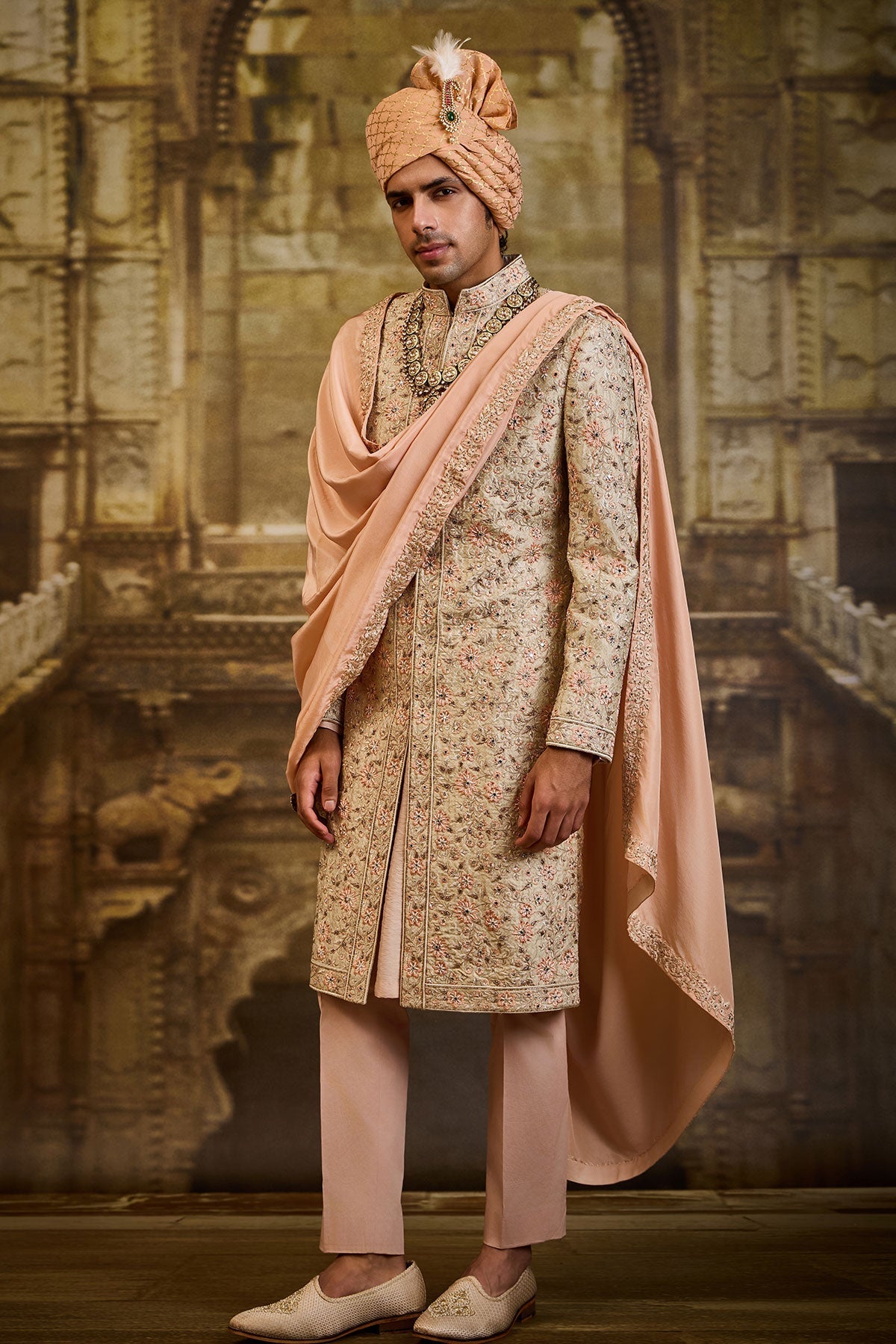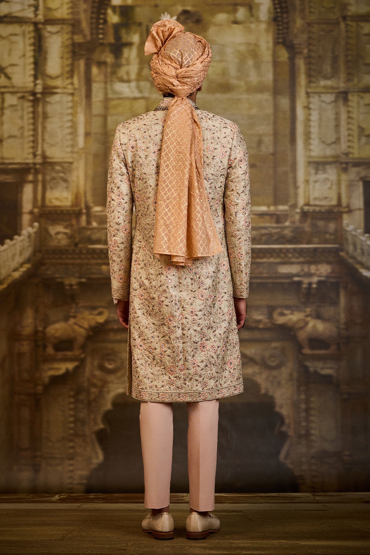 Ivory Brocade Sherwani All Over Embroidered With Tonal Resham Highlighted With Beads, Dabka And Moti Accompained With A Cotton Silk Kurta And Pant. An Optional Gold Tissue Worked Stole, And Worked Jutis Can Be Ordered Additionally.