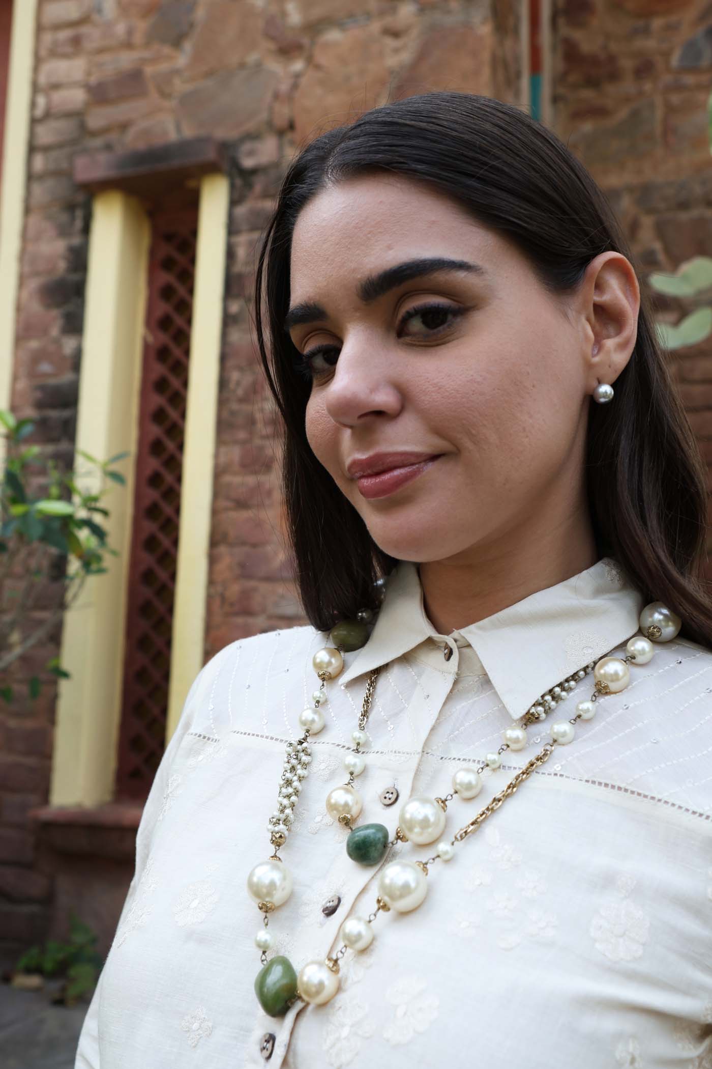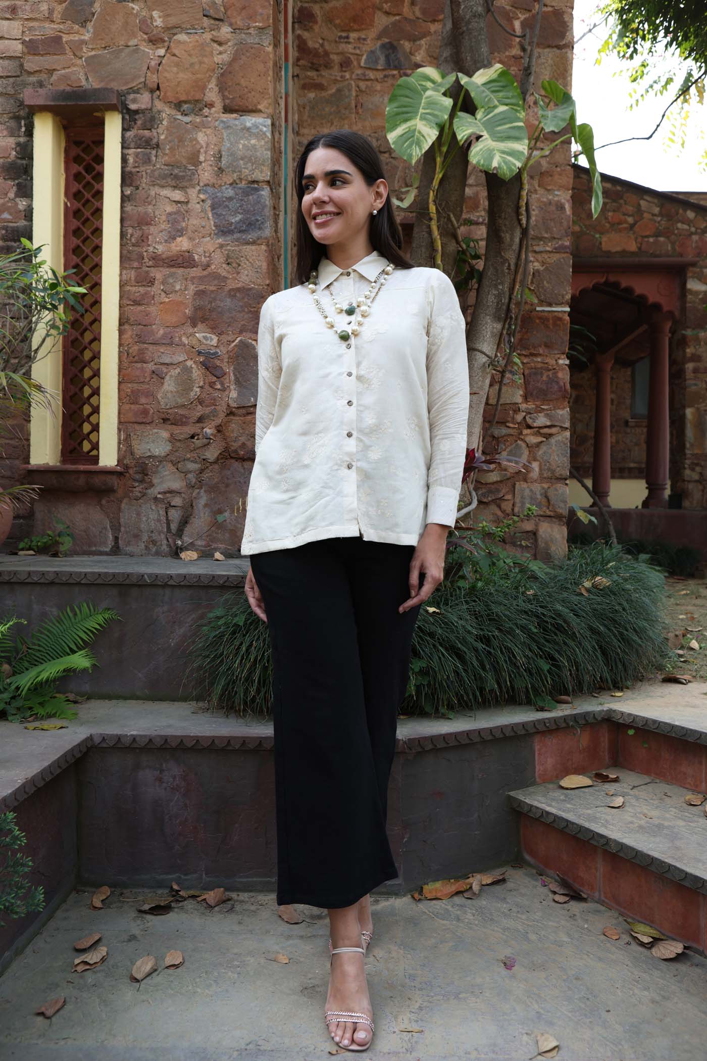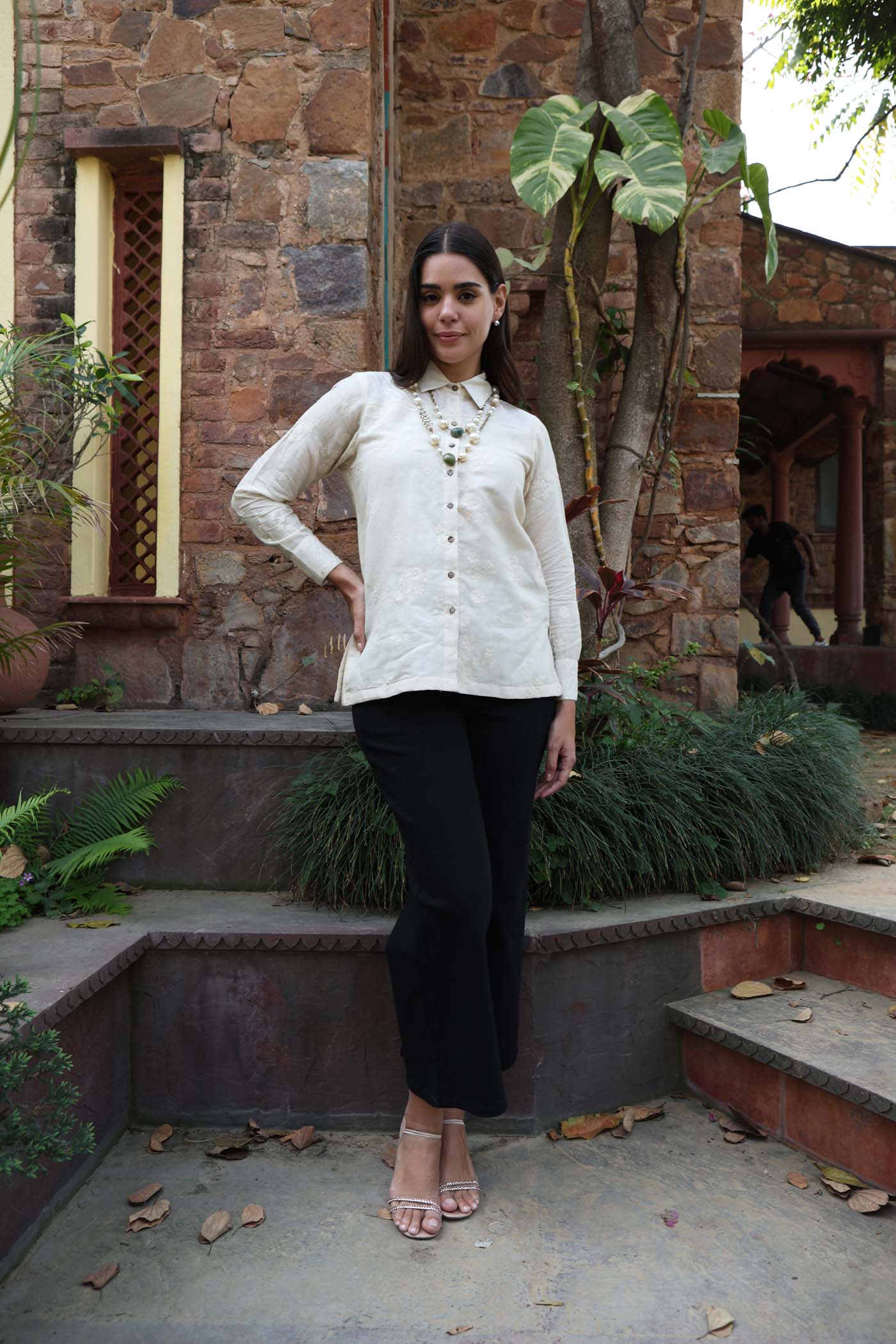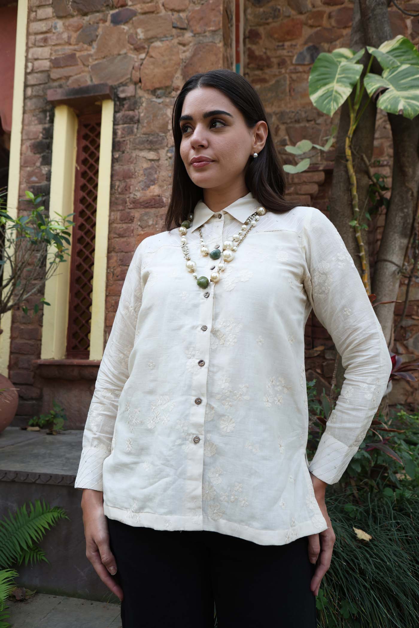 This Is An Ivory Handloom Pure Linen-Cotton Collared Short Blouse. The Blouse Has Been Embroidered All-Over And Has A Defined Shoulder-Yoke And Cuffs. The Blouse Has Been Lined With Pure Cotton For Added Comfort.