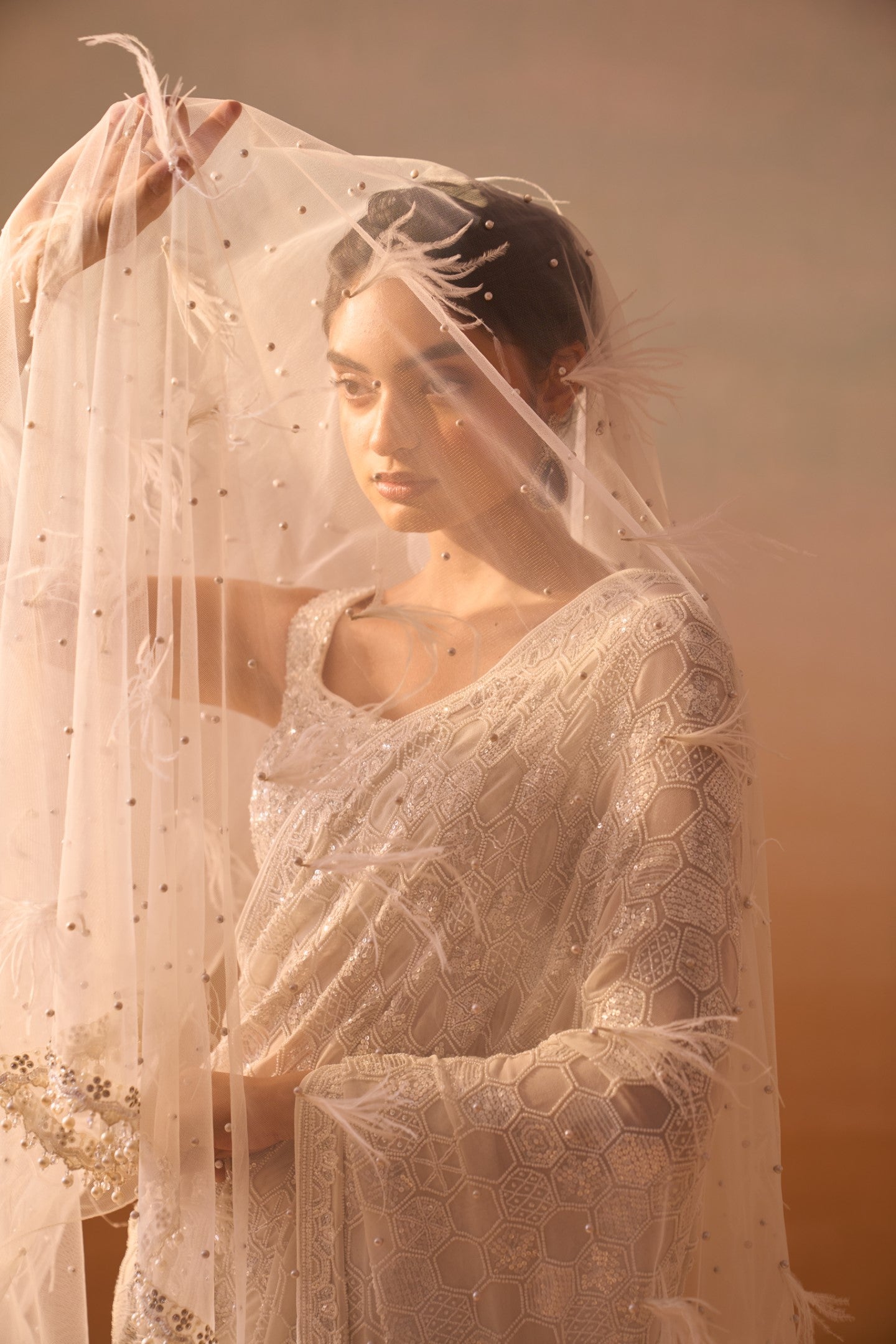 An ivory georgette saree with a net embroidered blouse embellished with sequins, beads and stonework.