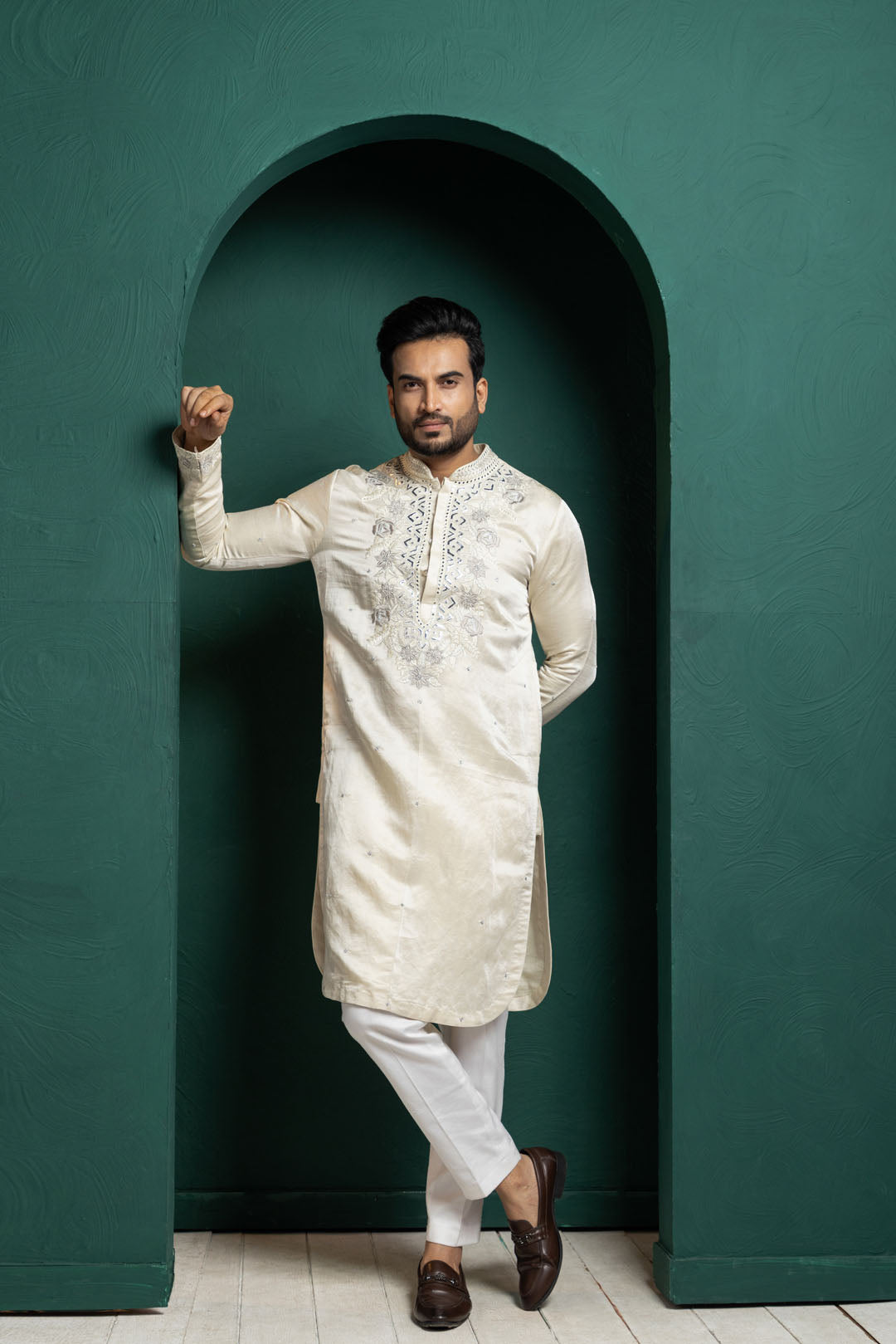 Radiate elegance with this stunning ivory kurta, adorned with exquisite floral and geometric embroidery in subtle neutral tones. Crafted from premium fabric, it offers a perfect balance of style and comfort. The intricate embroidery detailing along the neckline and bodice adds a touch of refined artistry, making it ideal for formal occasions, festive celebrations, or cultural events. Its versatile ivory hue allows easy pairing with a variety of bottoms, creating a sophisticated and timeless look.