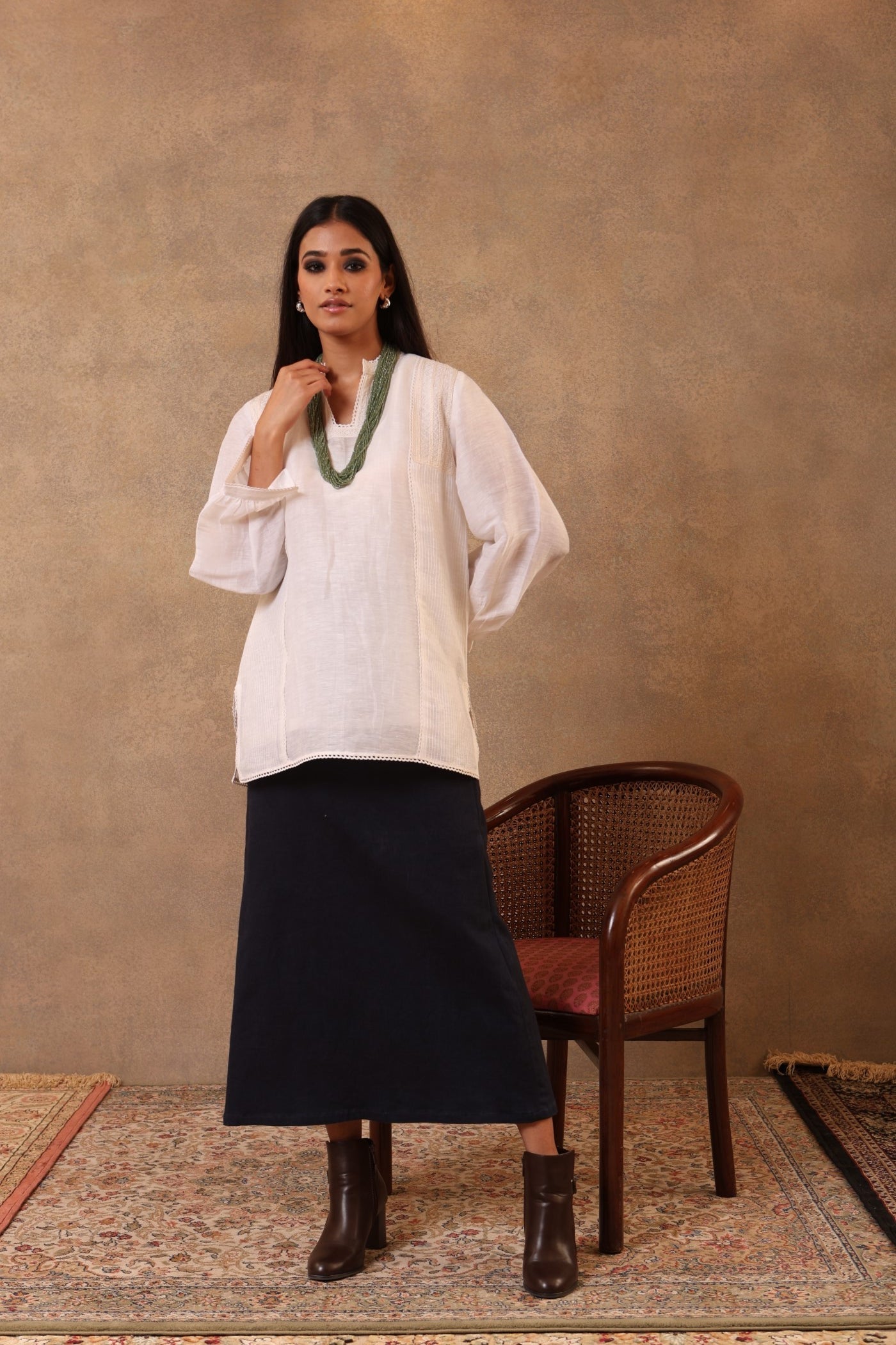 This Is An Ivory Short Blouse With A Laced Collar. The Geometric Pattern On The Blouse Has Been Completely Hand-Embroidered With Cotton Threads And Finished With Cotton Laces