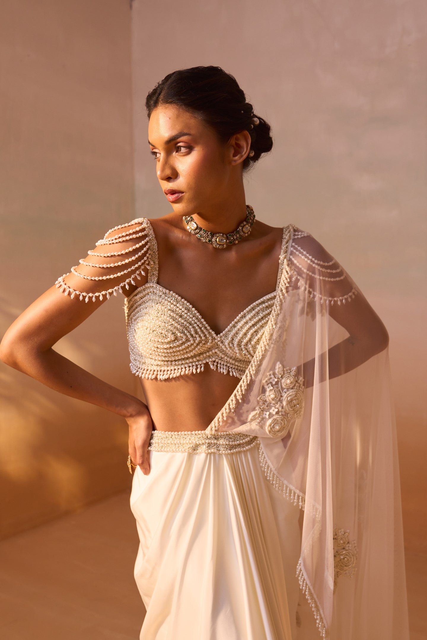 Ivory satin pre-draped saree with pearlwork enhanced with a bustier.