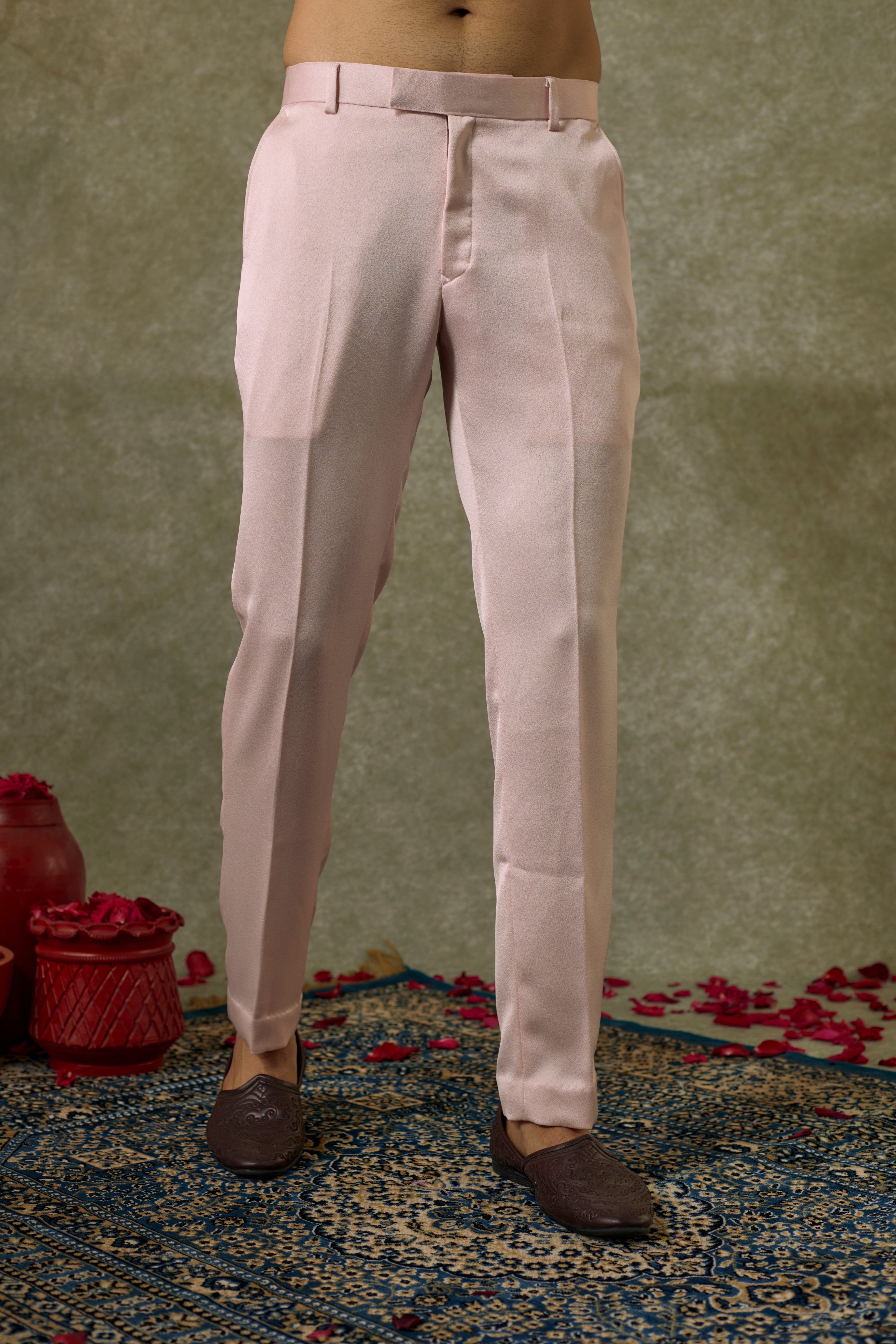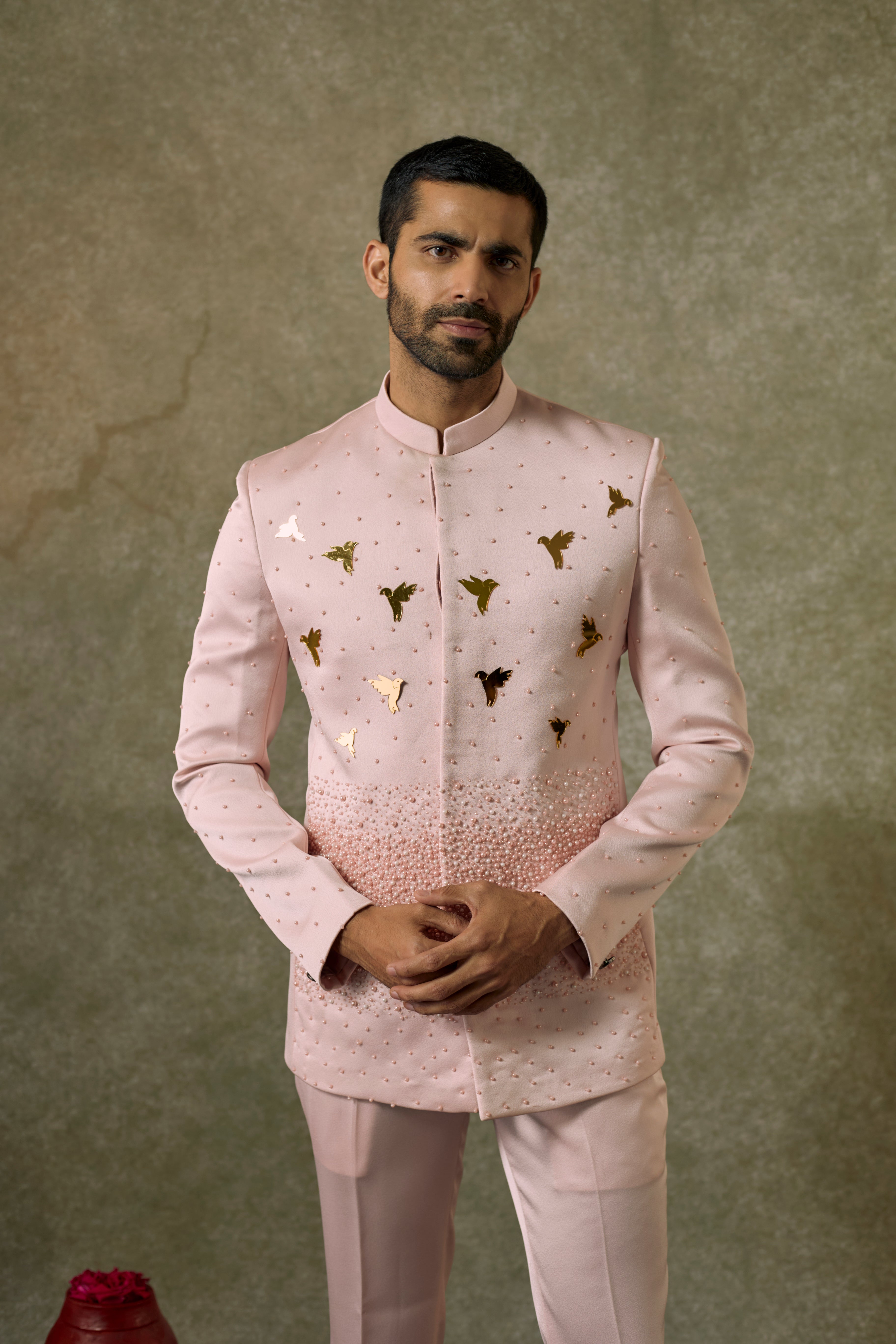 Ivory pink Jodhpuri Set in Imported Japanese Fabric with placement of cutdana handwork paired with Matching fitted bottoms making it an ideal fit for Wedding and Reception.
