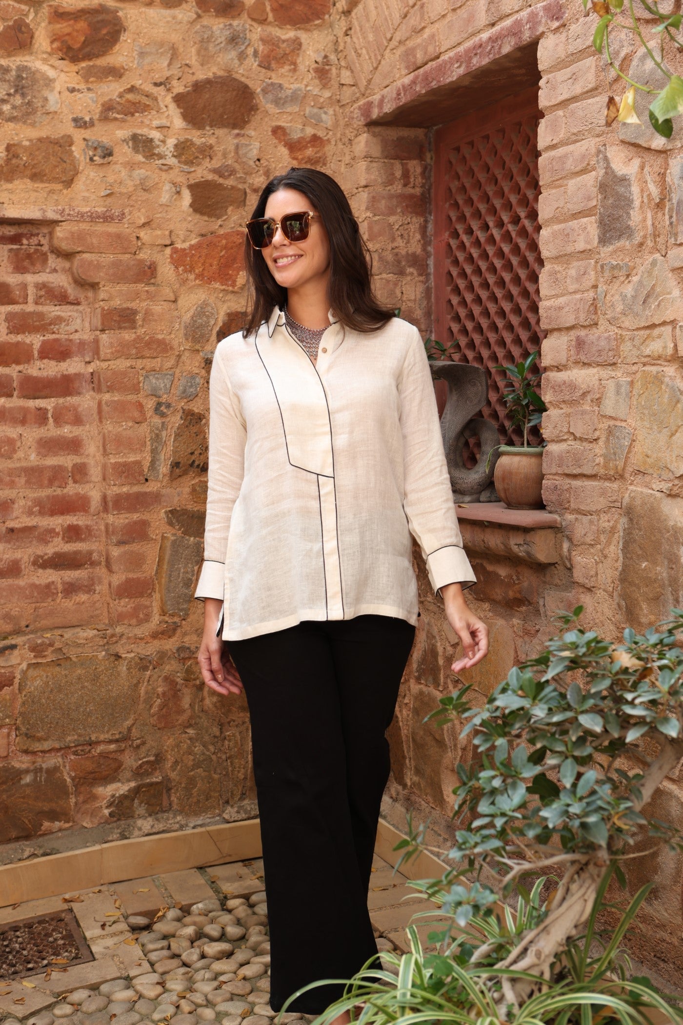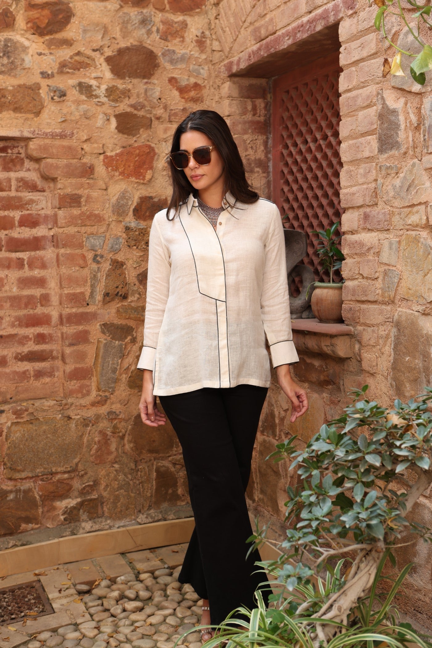 This Is An Ivory Pure Linen Collared Front-Open Short Blouse. The Blouse Has Contrast Edgings All-Over And A Concealed Front Placket. The Blouse Has Been Finished With Coconut Buttons.