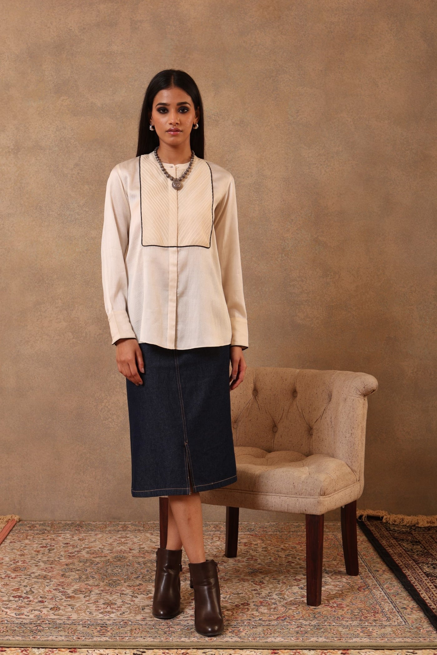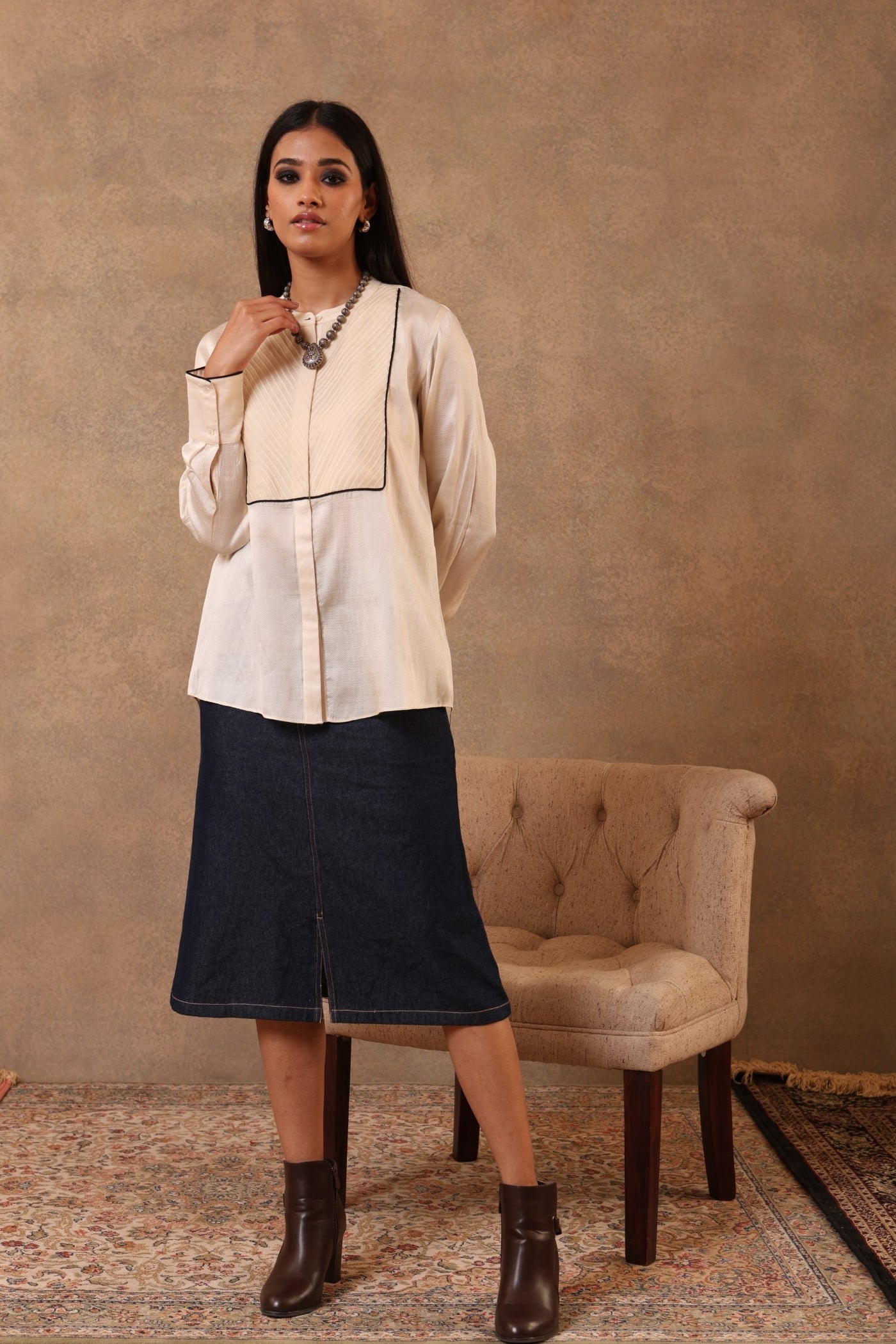This is an ivory short blouse made from pure silk in twill weave. The blouse has a pin tucked yoke in pure cotton silk and has been finished with black edgings which enhances the overall effect.