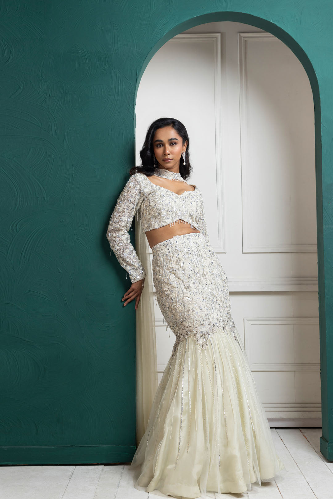 Exude luxury and grace with this breathtaking ivory lehenga set. The intricately designed blouse features crystal embellishments and a chic front knot detail, paired with a mermaid-style lehenga skirt that radiates elegance. The set is enhanced by delicate, shimmering accents, creating a captivating look. Perfect for receptions, cocktail events, or grand celebrations, this ensemble is designed to make a statement with its timeless charm and opulent detailing.