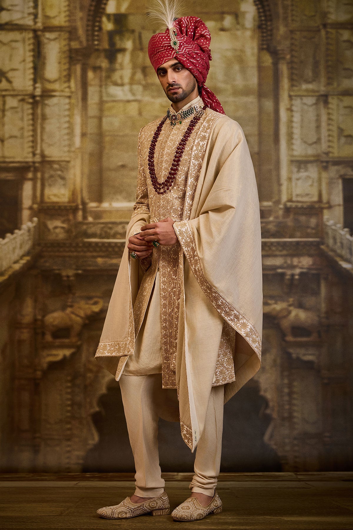 Ivory Taffeta Silk Sherwani All Over Embroidered With Beige Dori, Dabka And Beadwork With Cotton Silk Kurta And Churidar. It Is Accesorised With An Optional Worked Stole, Belt And Worked Jutis Which Can Be Ordered Seprtately