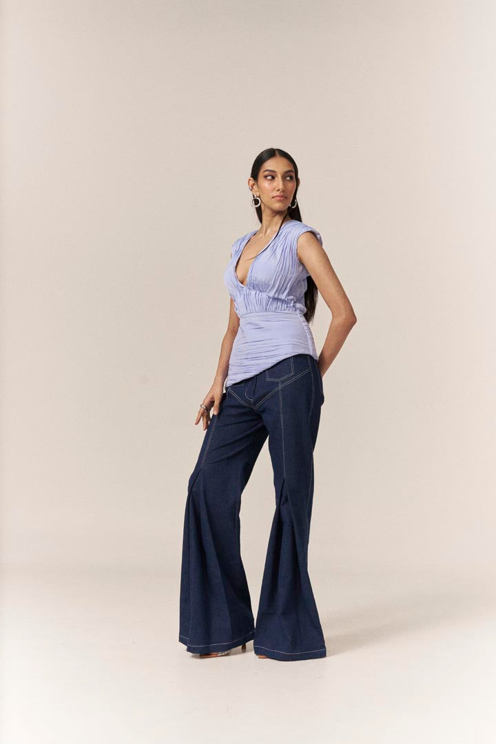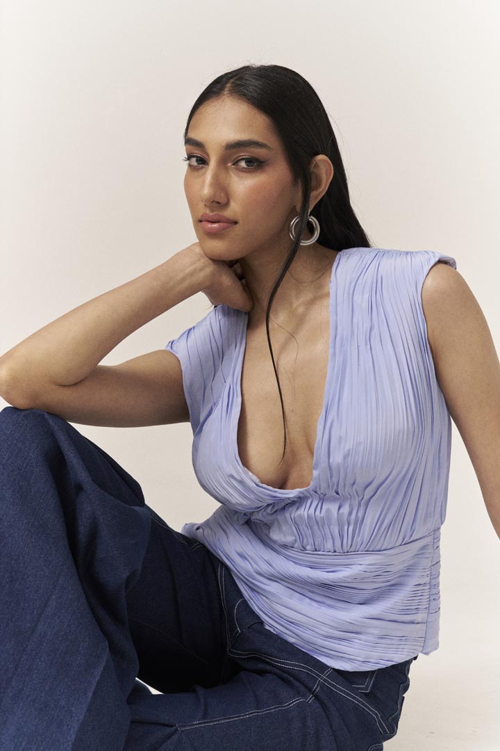 Ivy, must-have pleated top paired with structured denim, designed to elevate your wardrobe. This unique fit allows each piece to shine on its own, offering versatility for countless styling options. The casual fit features a deep V-neck and a flattering bodycon silhouette, complemented by an asymmetrical tunic top and sleek stretch fair jeans. Plus, both pieces can be purchased separately, giving you the freedom to mix and match for effortless, everyday outfits that stand out!