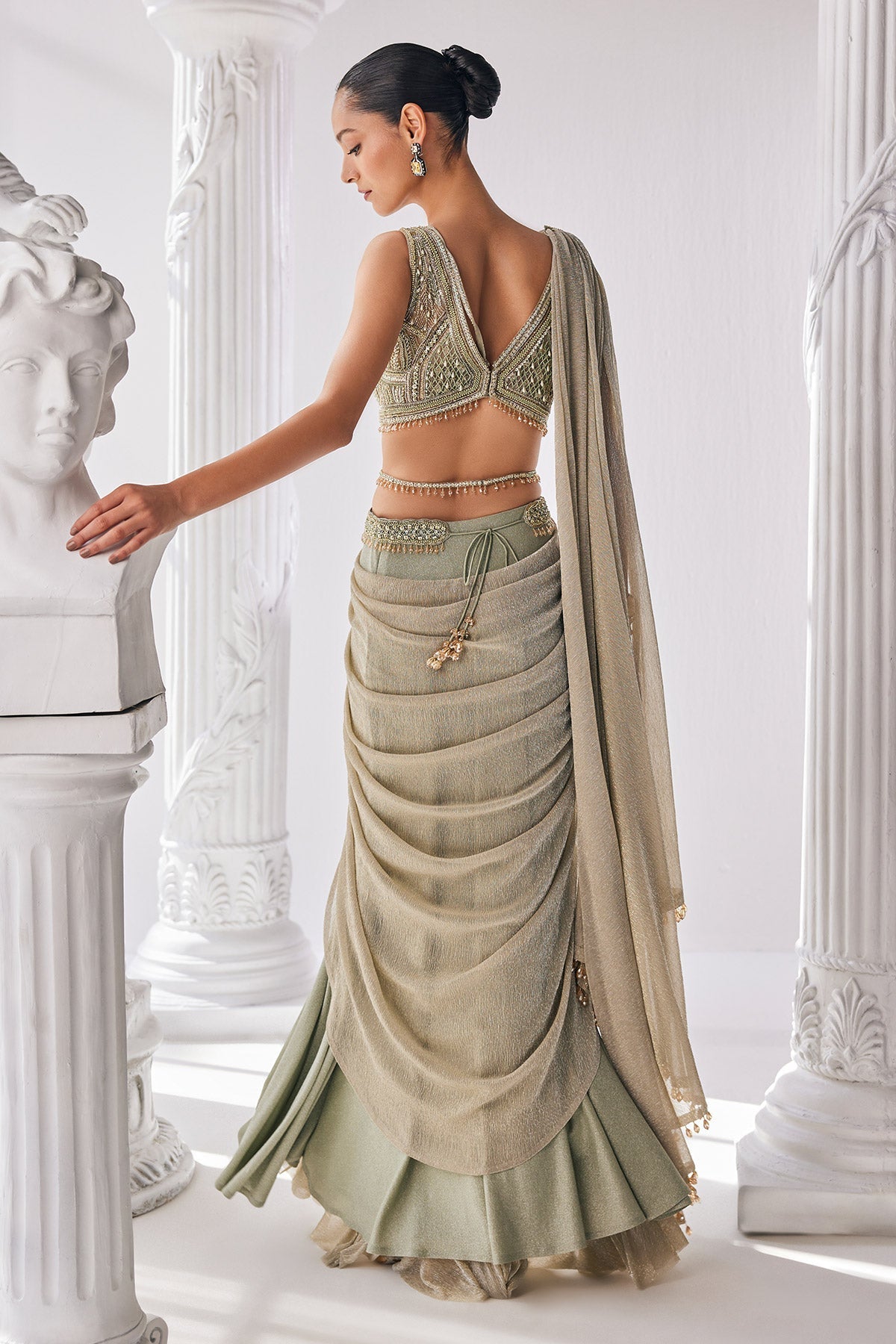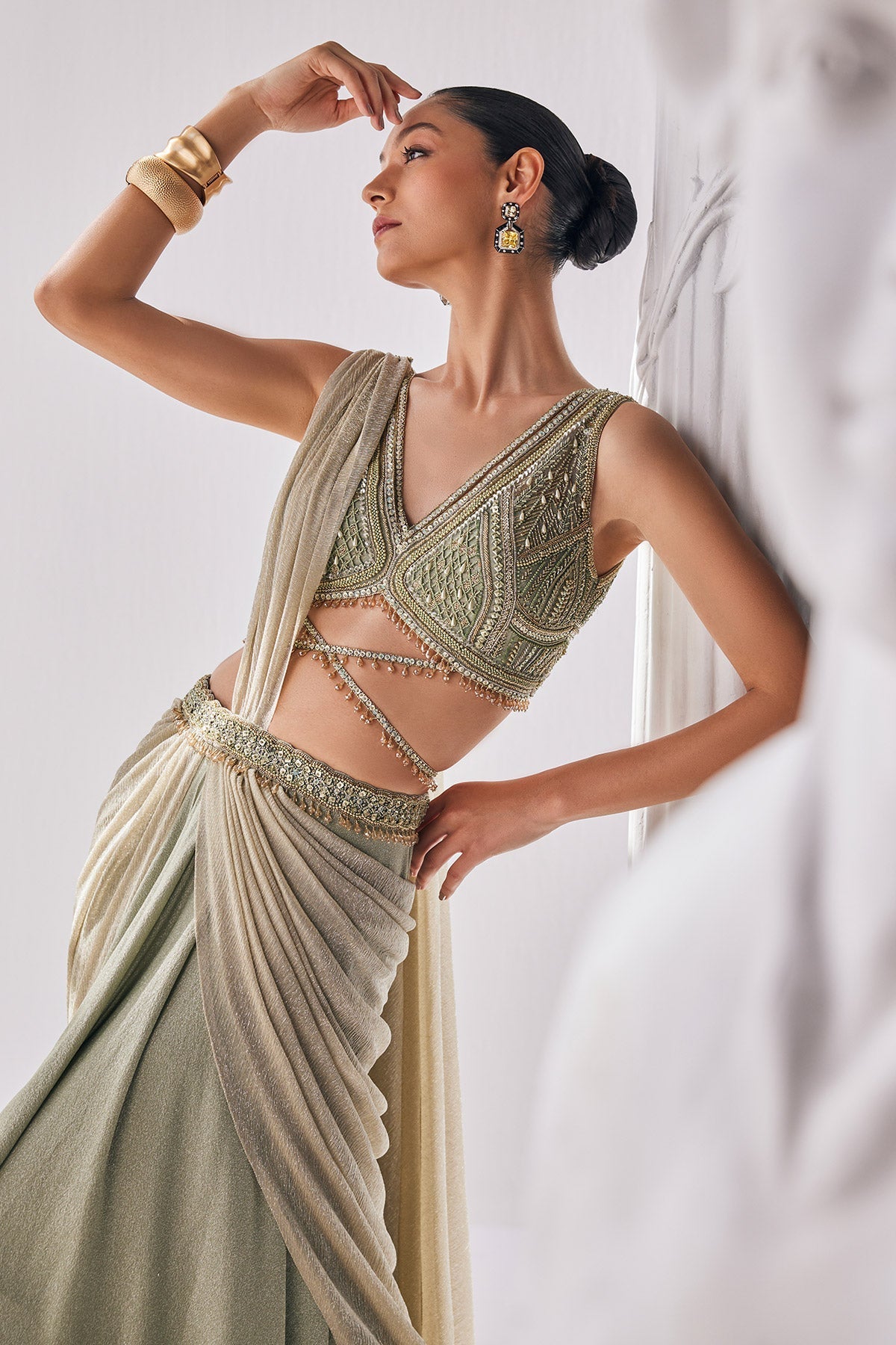 Jade green draped saree crafted from a blend of lycra and crinkle fabric. Paired with a chic plunging neck blouse adorned with intricate beadwork and sequin detailing. This ensemble effortlessly combines modern flair with traditional charm.