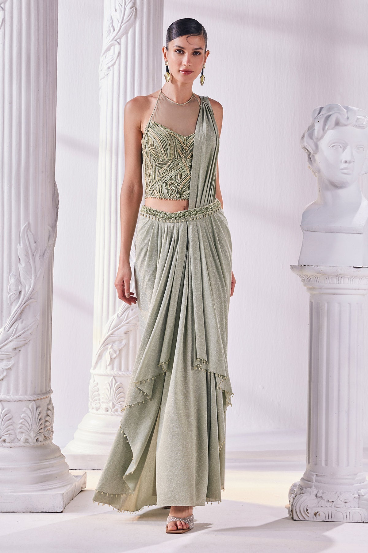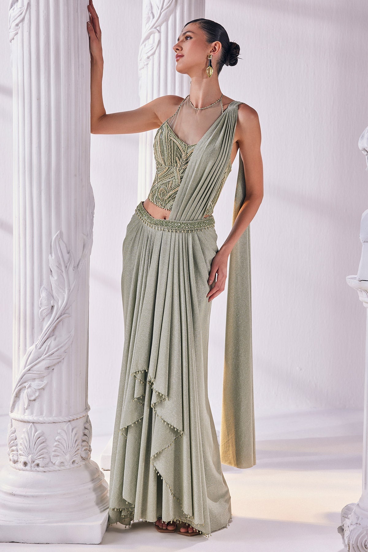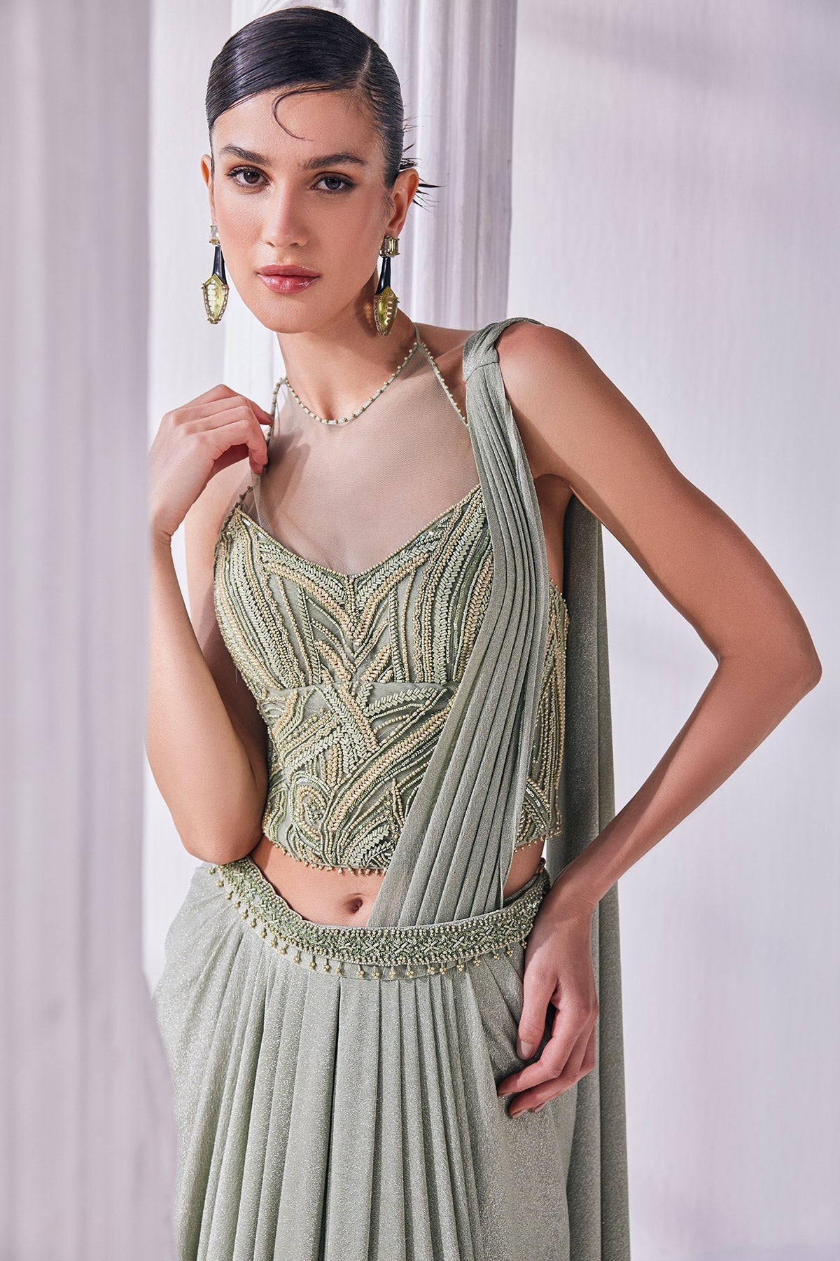 This exquisite draped saree, adorned in shimmering sequins and beadwork. The intricately designed corset steals the spotlight with its opulent, heavy embroidery.