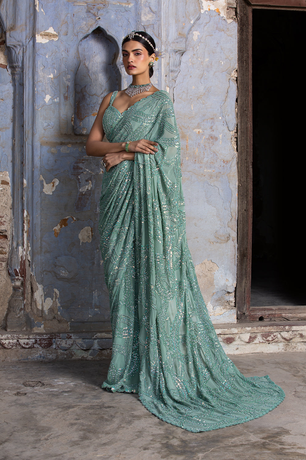 Jade Green Georgette Saree with organza blouse heavily embroidered in tonal beadwork and crystals.