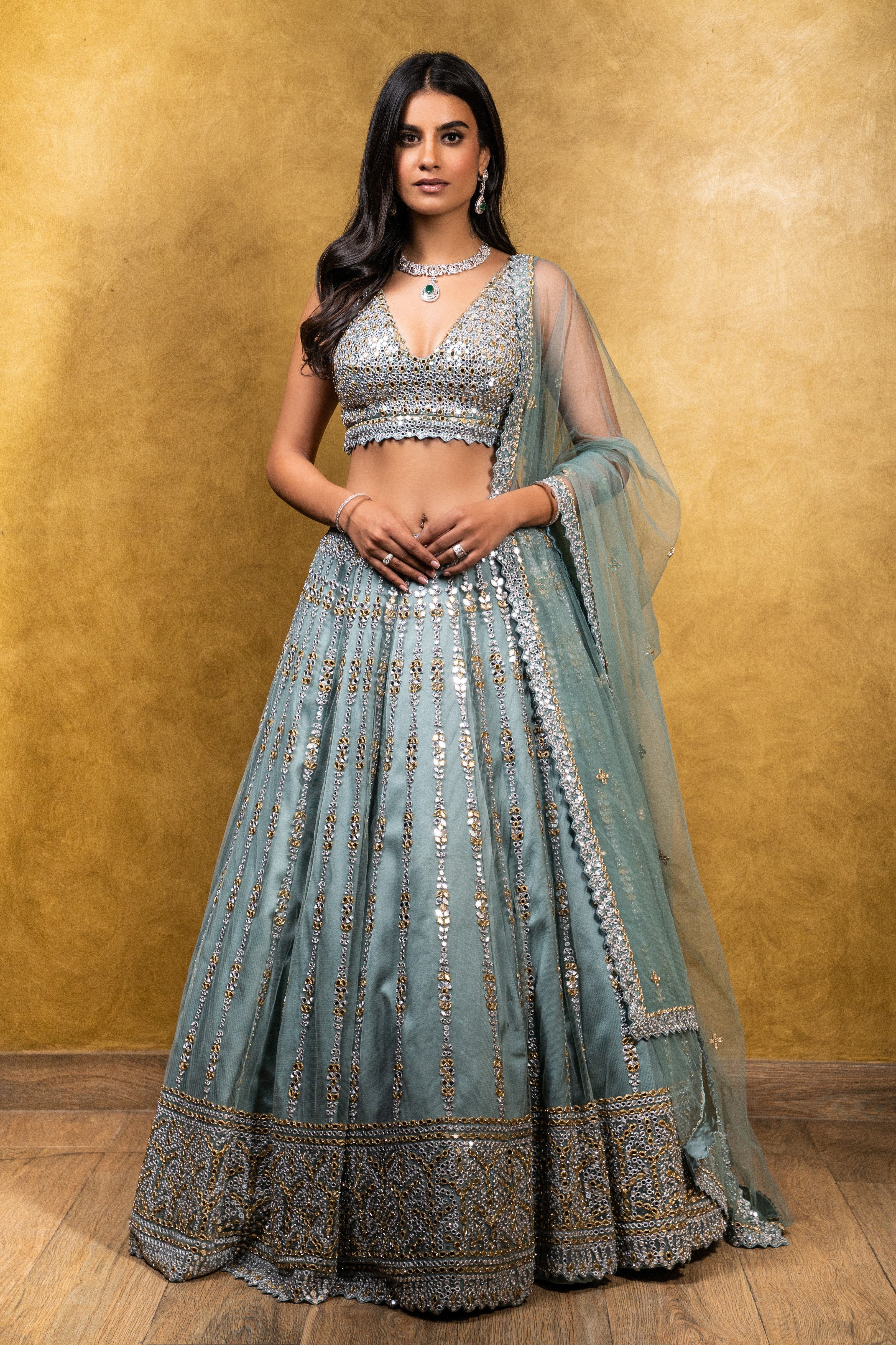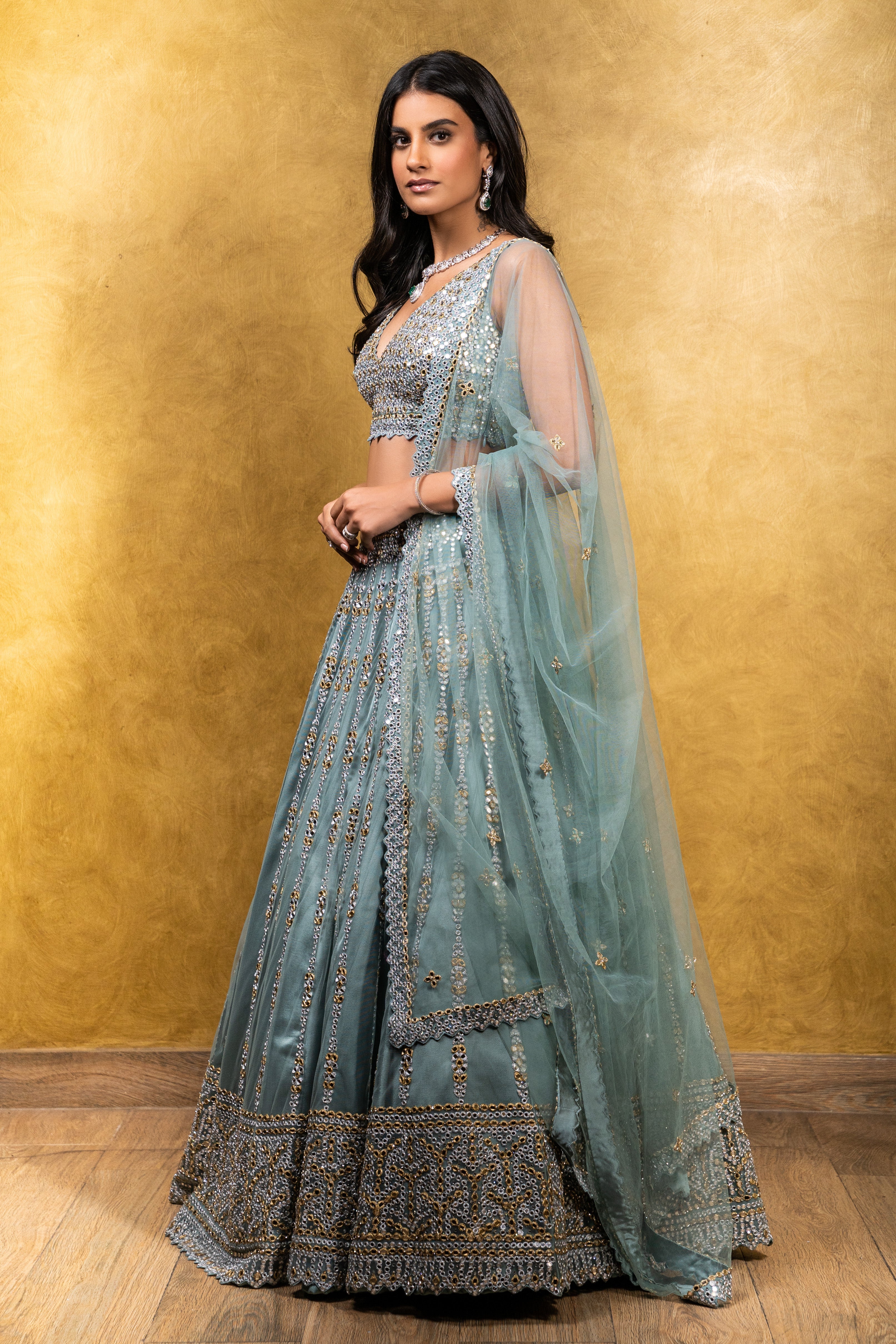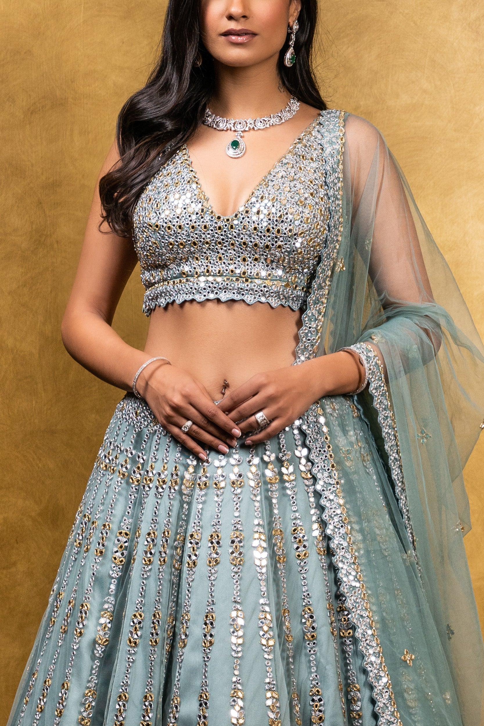 Jade green tulle lehenga with mirror, silver & gold bead work.