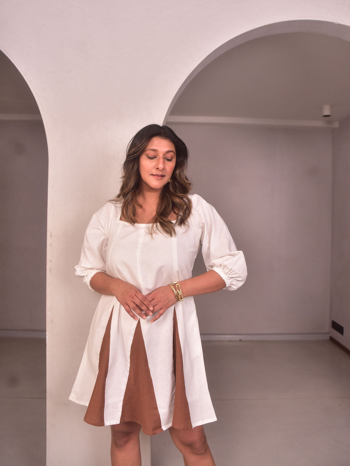 Cut in white cotton linen with brown godet panels at the waist, this short dress offers a charming mix of volume and structure. The wide square neckline, 3/4th puff sleeves, and side pockets lend it a soft, feminine appeal. Ideal for daytime events or relaxed travel outings, style it with tan flats and a woven bag for an effortlessly refined look.