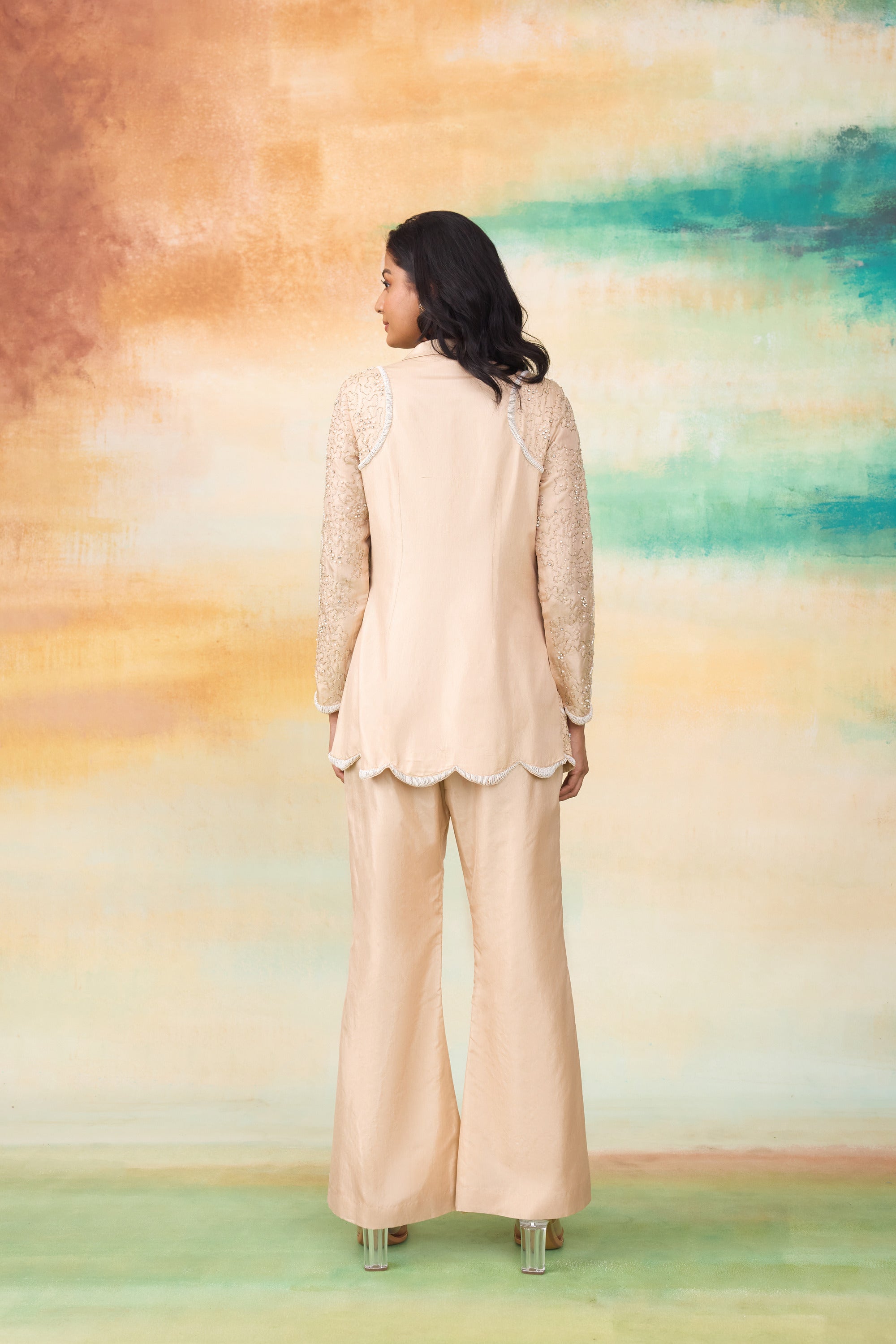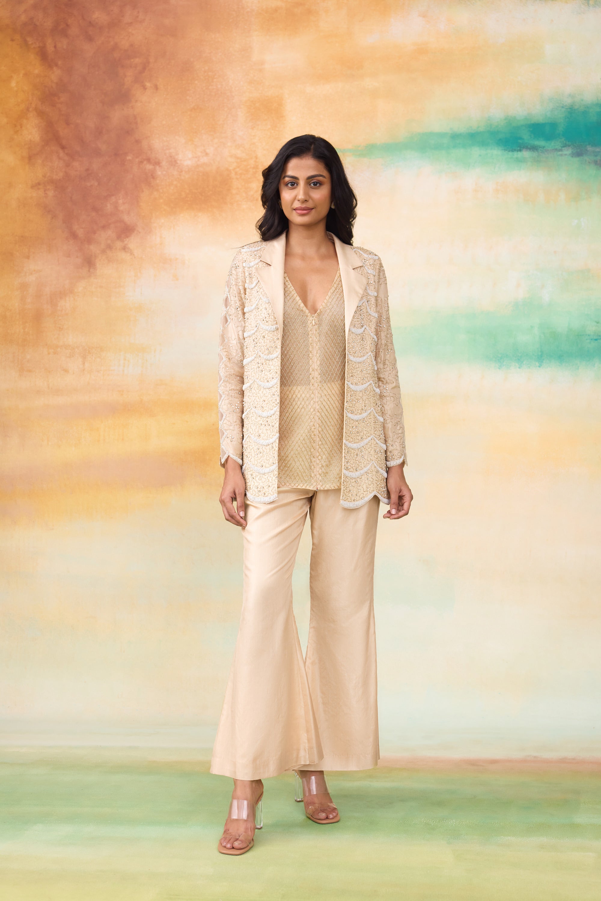 The pearl scallop detailing chamundi silk jacket and flared pant set is a statement of timeless elegance and contemporary sophistication. The jacket is adorned with intricate pearl scallop detailing, complemented by highly embellished pearl work, golden and silver embroidery, and shimmering crystal stones that add a