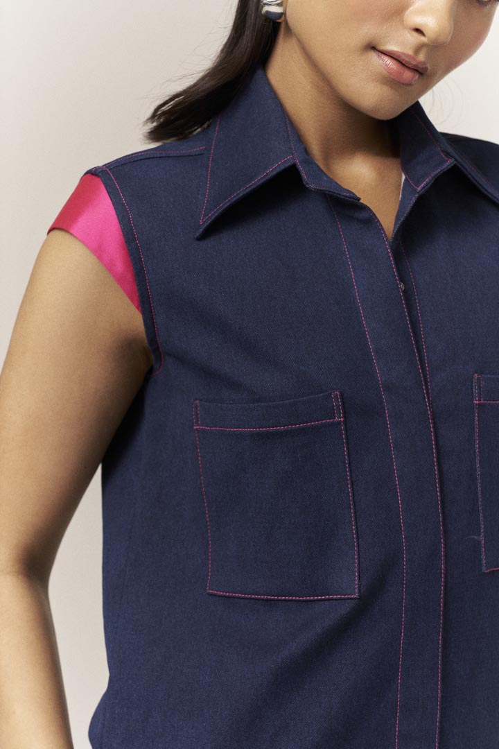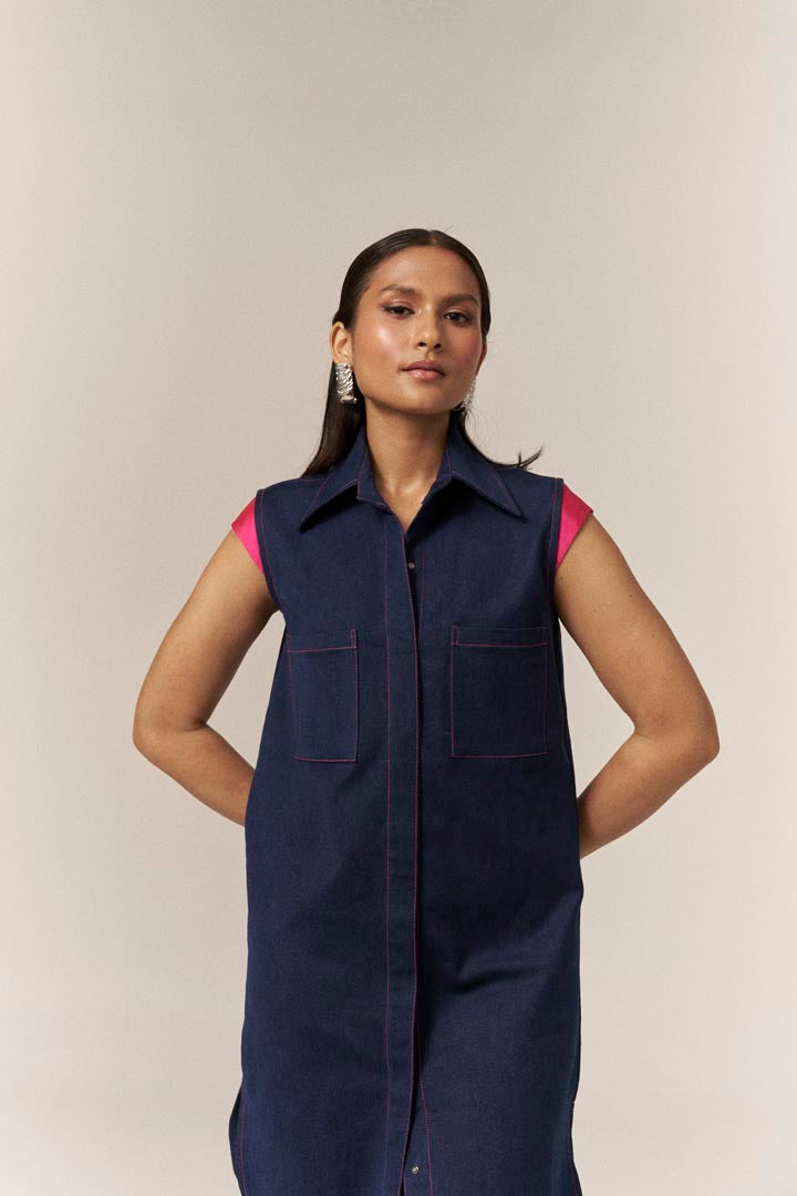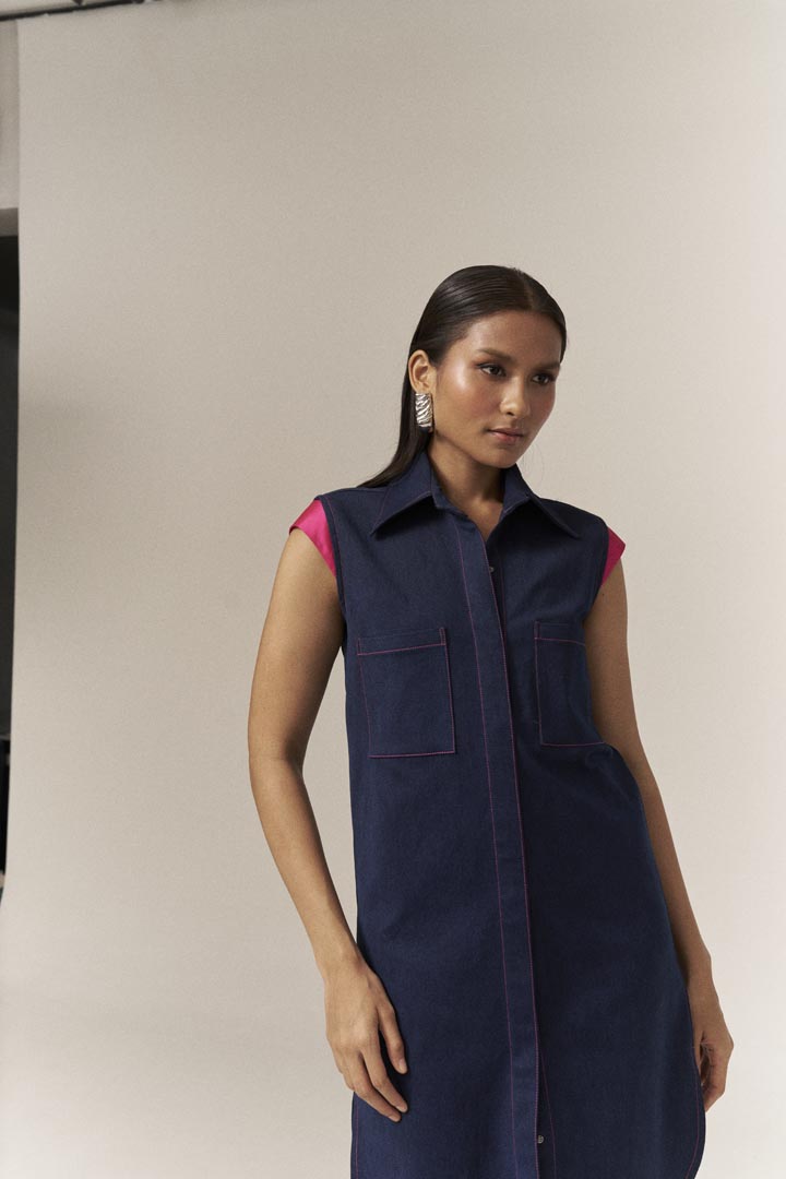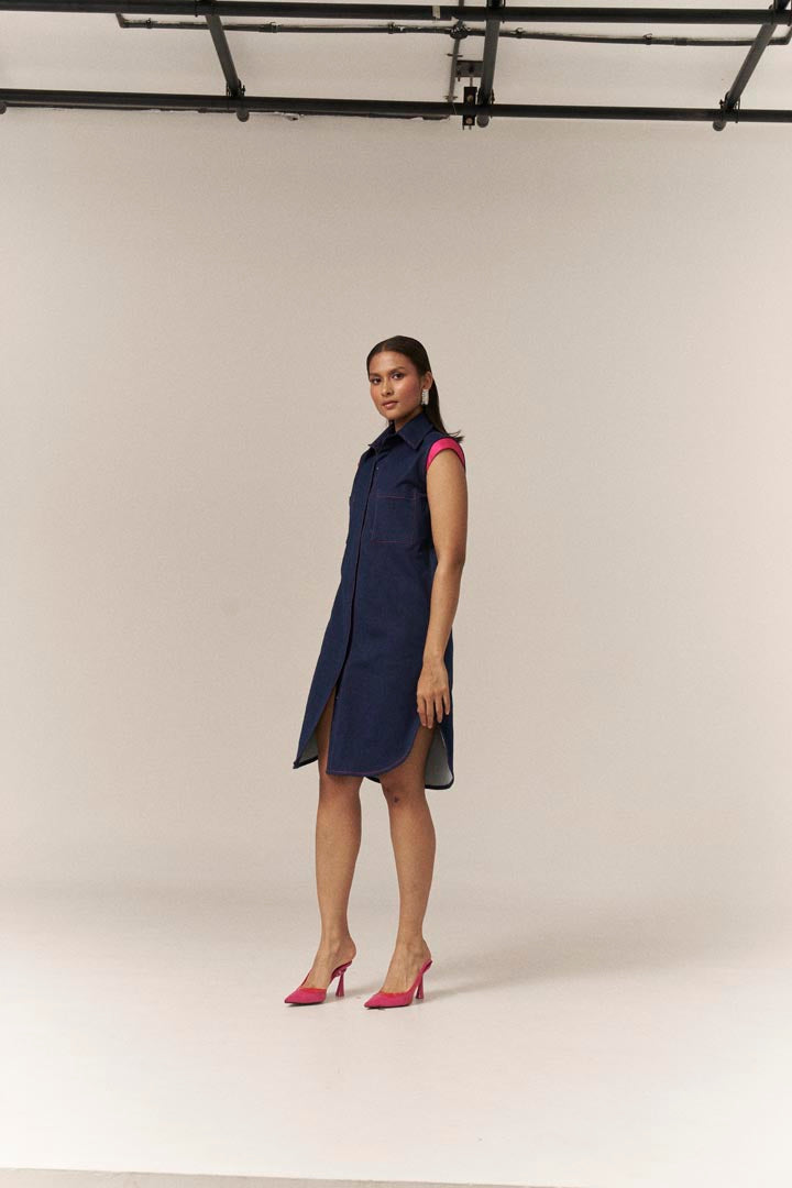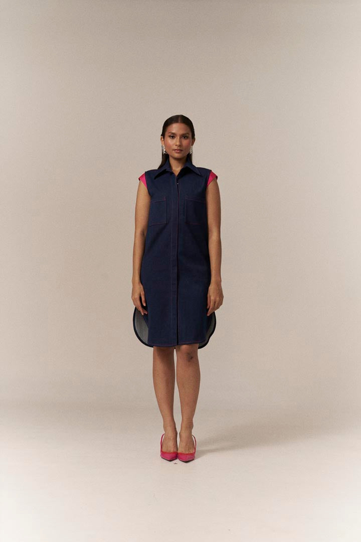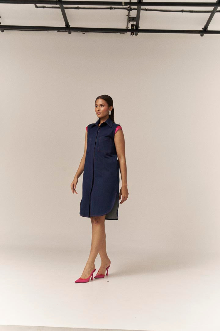 This dress is made of denim fabric. It has a collar, sleeveless design with pink accents on the armholes. The dress is knee-length with a front button closure.