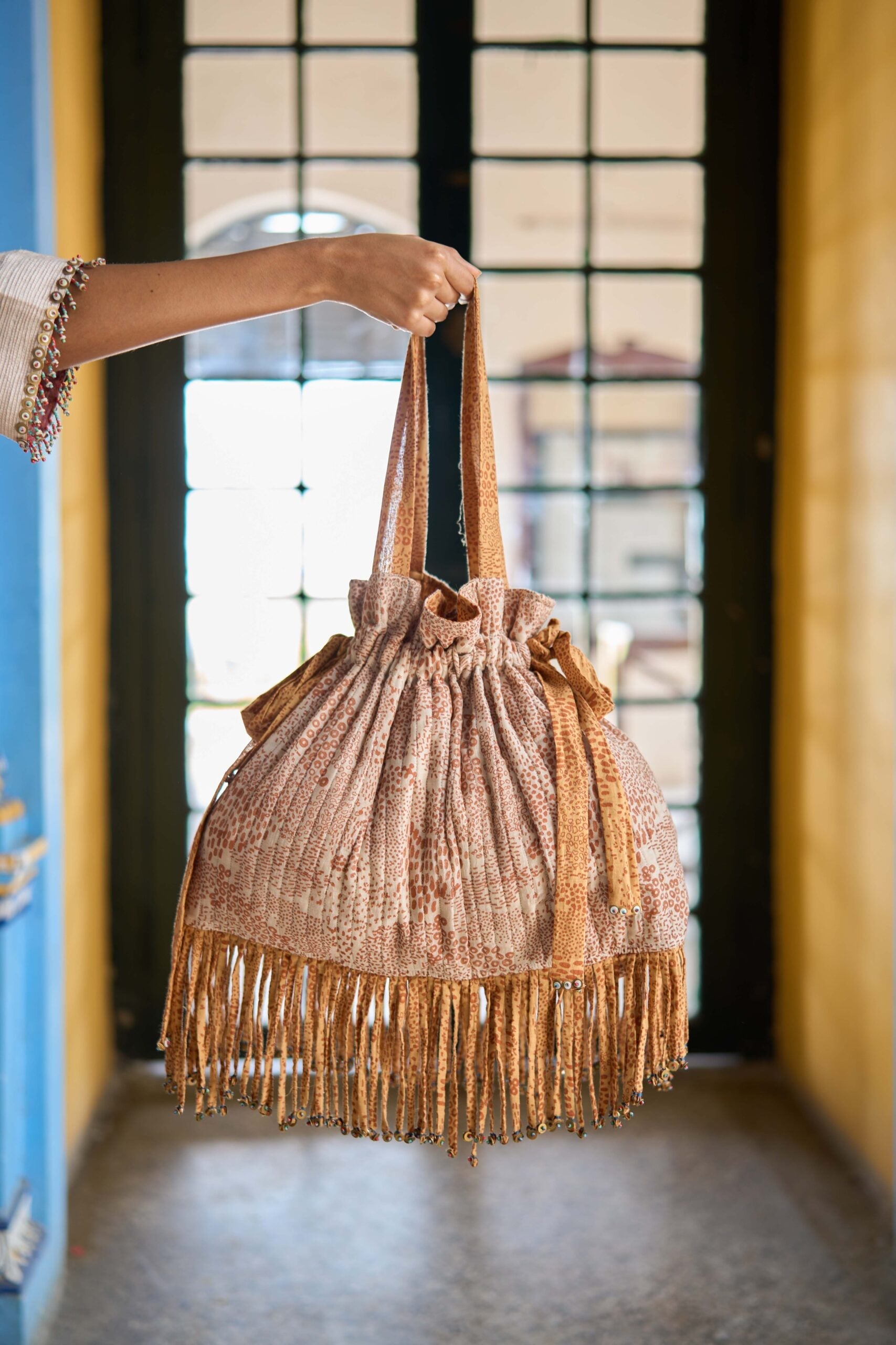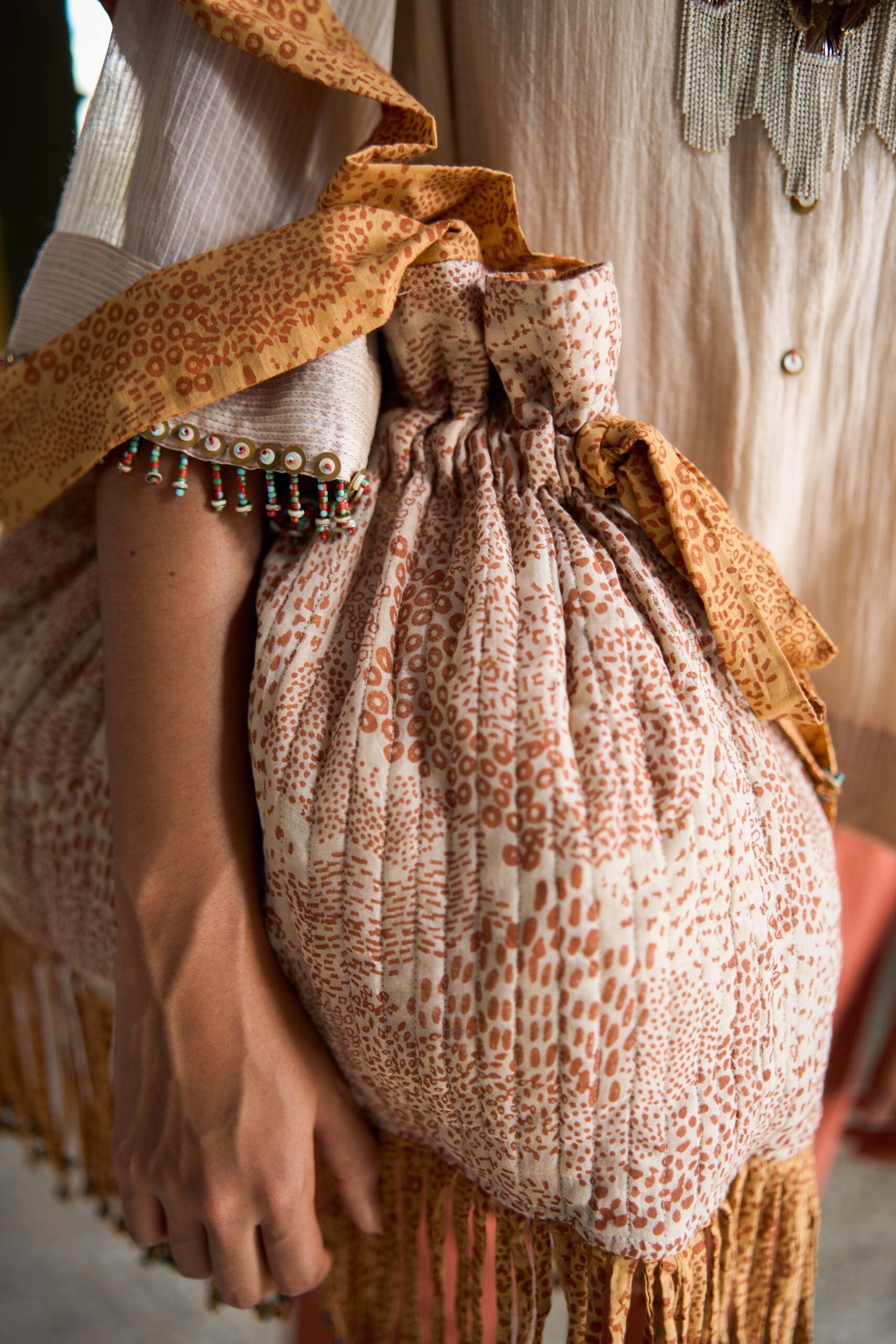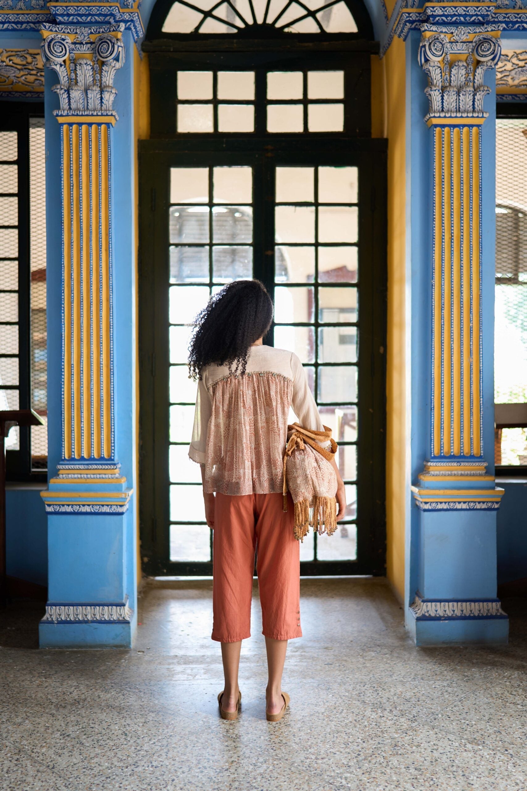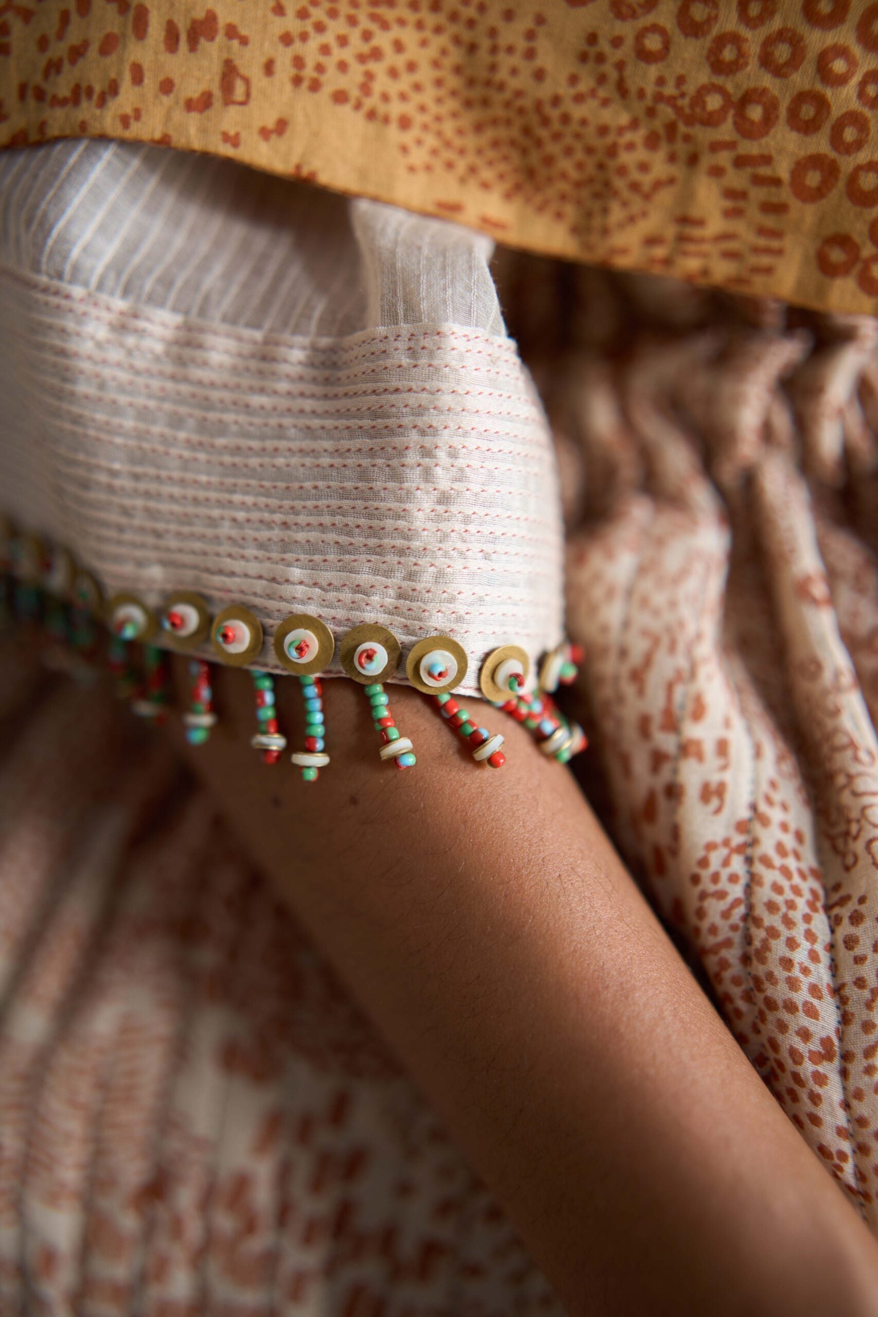 Self stripe chanderi top with a fine pintucked back yoke with a gathered back and hand block printed along withbeaded embellishments done by hand