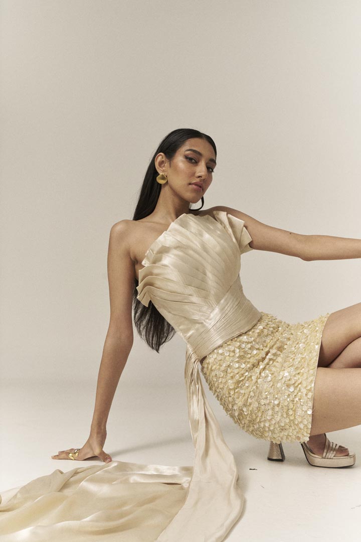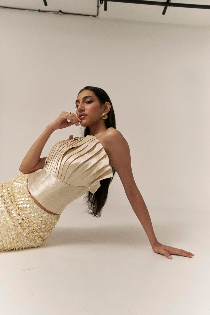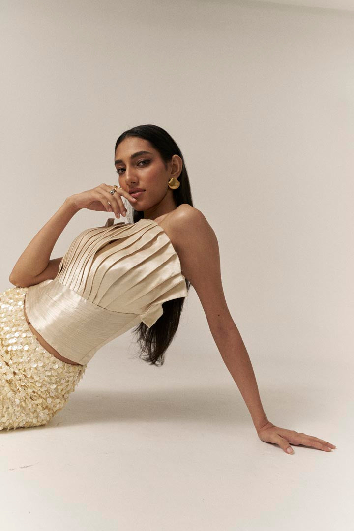 Our classic Style Kaia set, where sophistication meets casual elegance. This stunning ensemble features a hand-embroidered skirt adorned with shell sequins, perfectly paired with a stylish pleated top. Ideal for birthdays, bachelorette parties, and cocktail events, this set also offers versatility for vacations, shopping, and brunches when styled separately. Add a touch of nature-inspired luxury to your wardrobe with this beautiful combination!