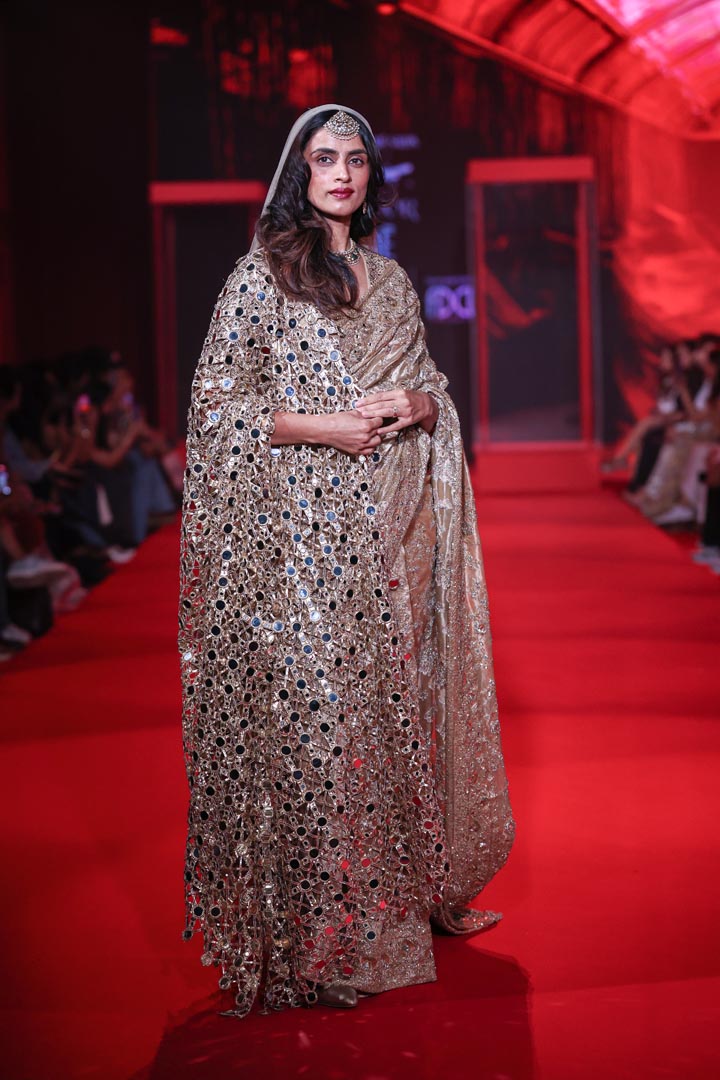 This is a gold tissue embroidered saree featuring intricate zari and mirror work that adds a rich texture and subtle sheen. It is paired with a sheesh poshida, beautifully crafted with circular mirror embellishments and delicate gota detailing, creating a timeless and elegant look.