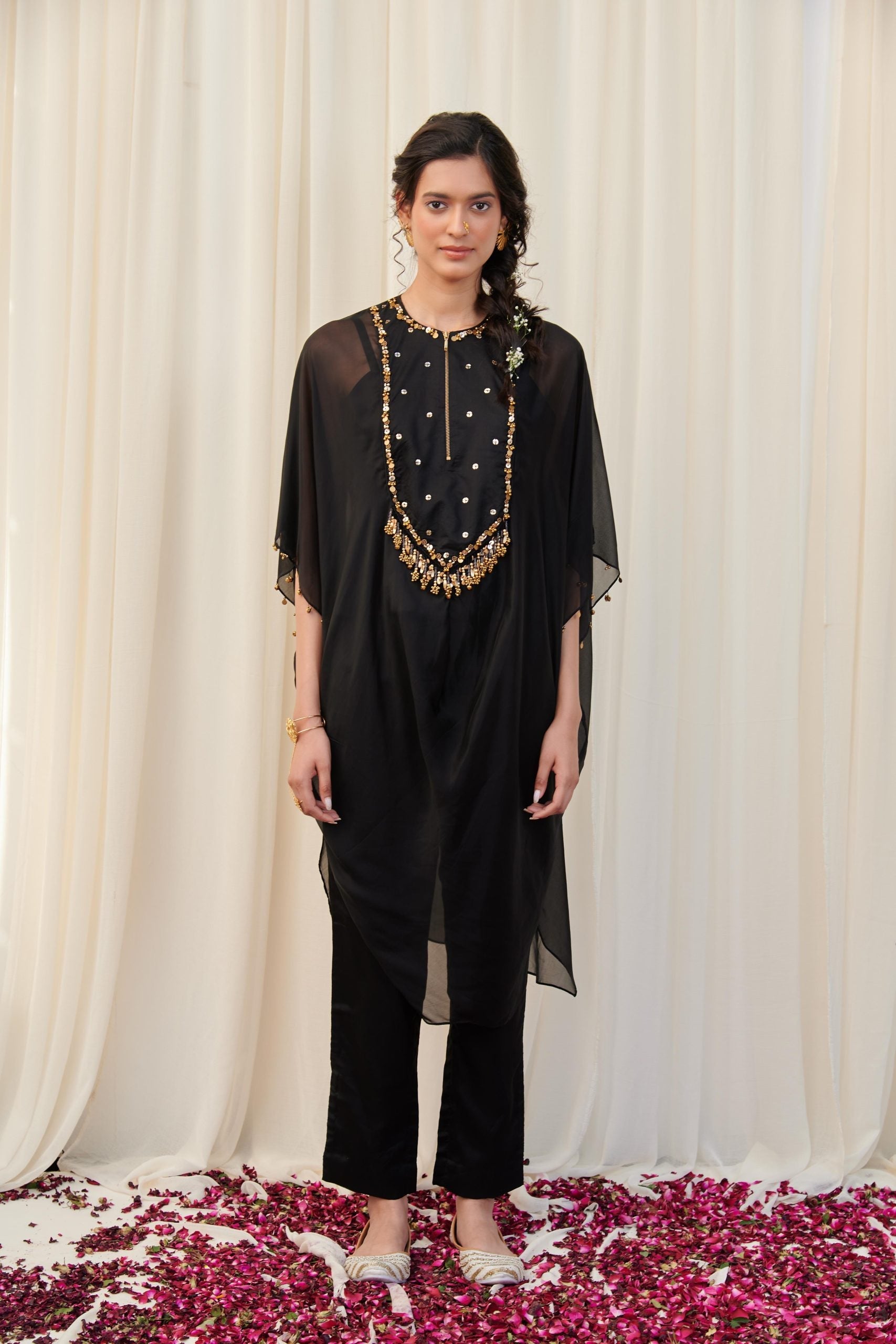 classic black hue, decorated with exquisite, intricate hand embroidery.