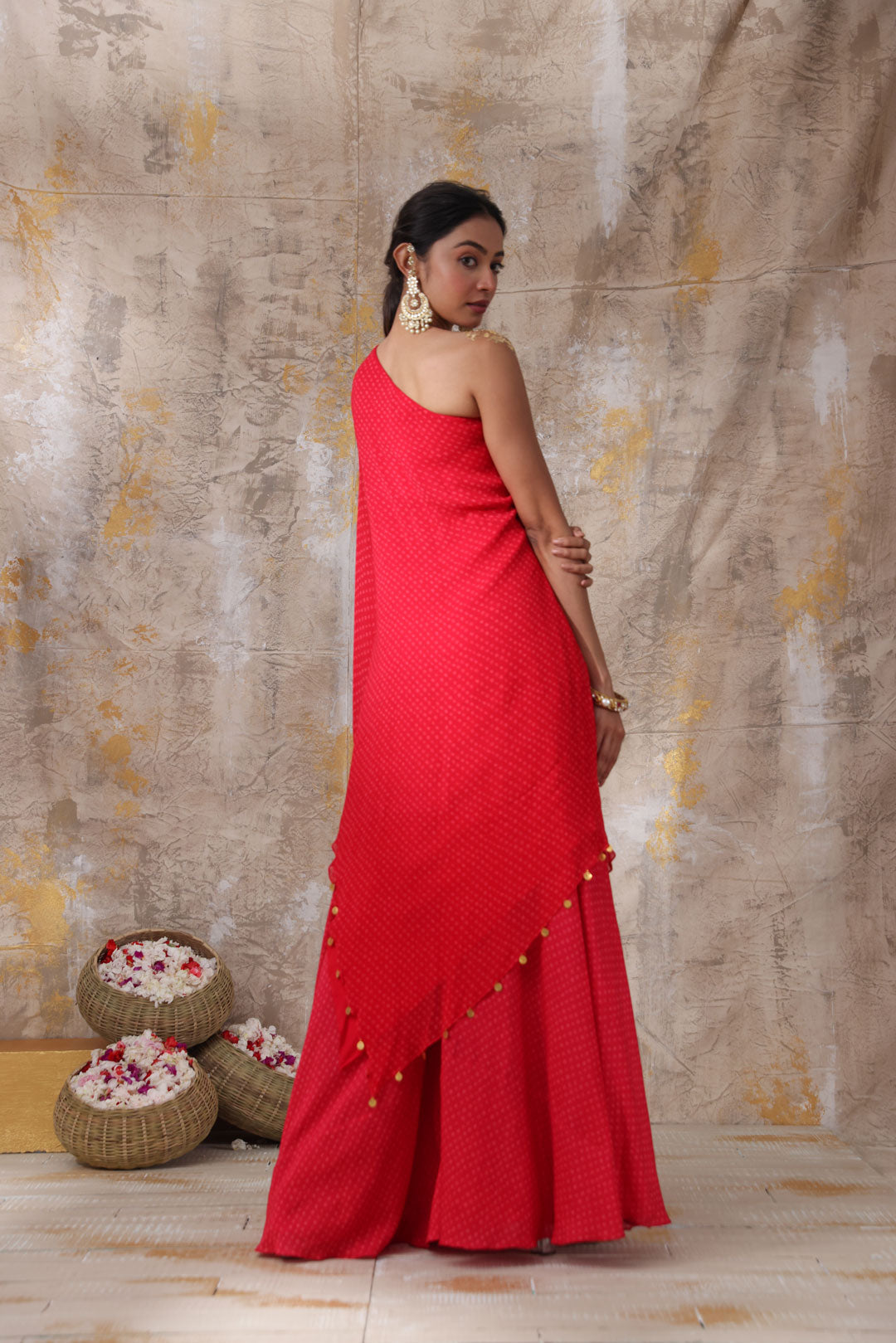 This one shoulder asymmetric tunic is sure to turn heads. it features a coin hemline and a matching bandhani printed palazzo. Kurta/tunic length is 50" from the shoulder. Palazzo length is 44". **The color may slightly vary due to screen lighting.