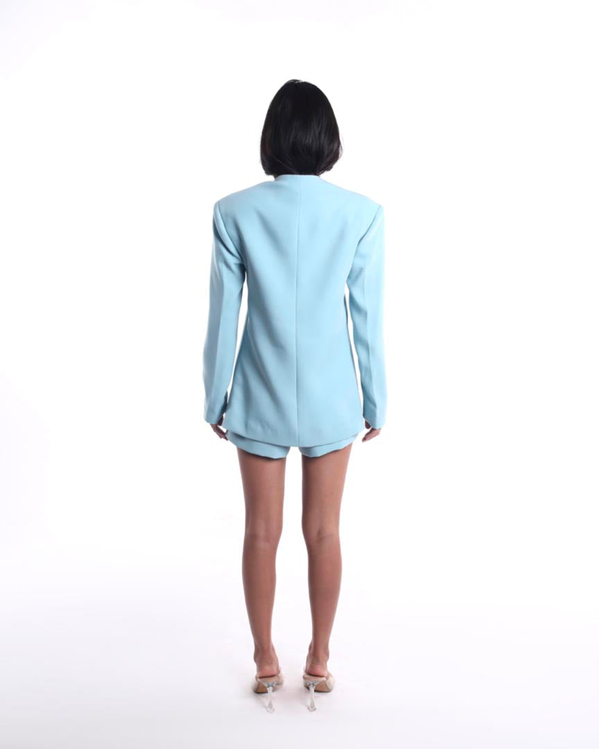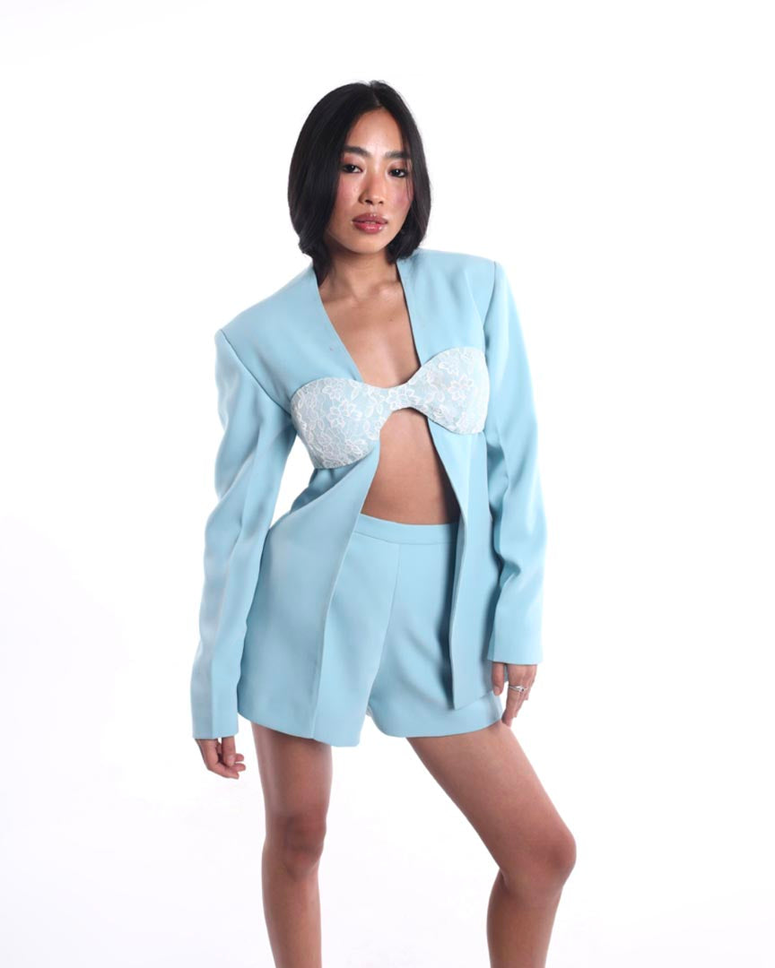 The KENDRAE set features a sculpted blazer with a daring open front, tailored shorts, and a dreamy lace bustier shaped like a soft bow. In powder blue, it strikes the perfect balance between sharp and sweet, ideal for when you want to command the room without saying a word. Modern muse. Structured seduction. Confident cool.