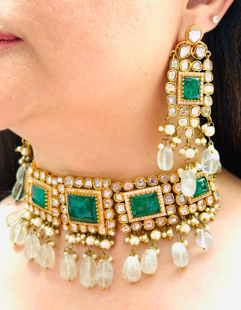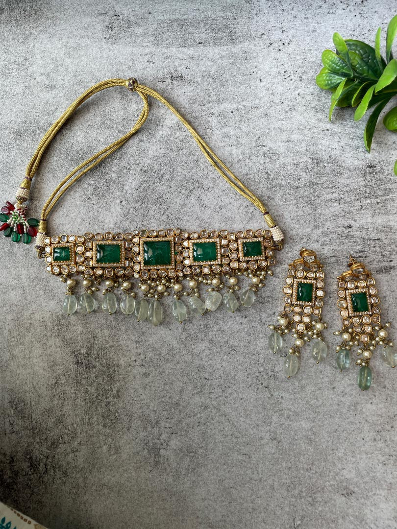 Kundan Choker and Earrings with Beads , Necklace L : 4, W: 7.3