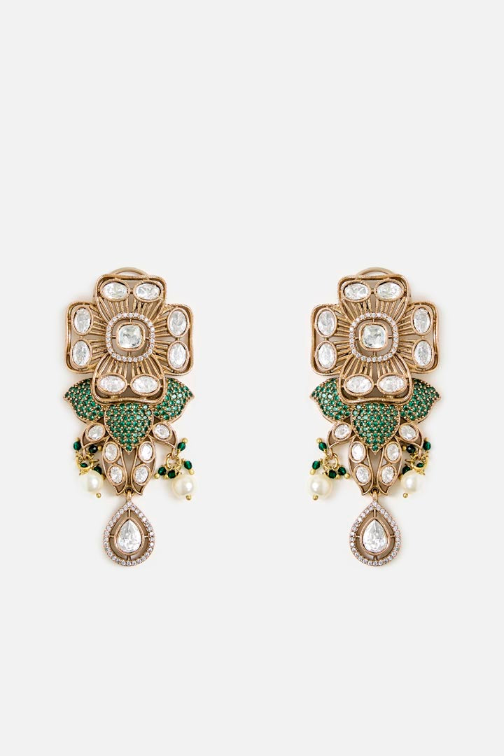 Stunning kundan & emerald statement necklace set with intricate floral motifs, pearl drops, and matching earrings. A regal piece, perfect for weddings, festive occasions, and traditional wear.