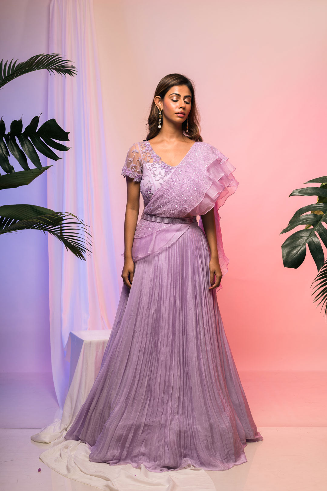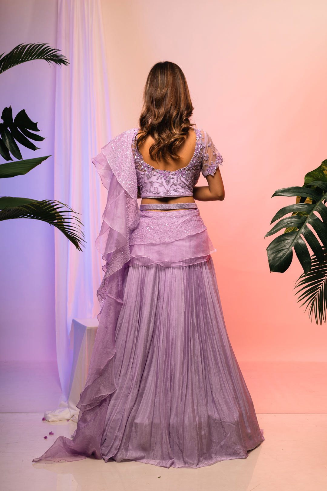 Thistle Lavender Lehenga Set, Comprising Of Tonal Embroidered Blouse, With Beads, Pipe And Sequence, Pleated Lehenga And Atached Ruffled Embroidered Palla, Held Together With An Embroidered Belt.