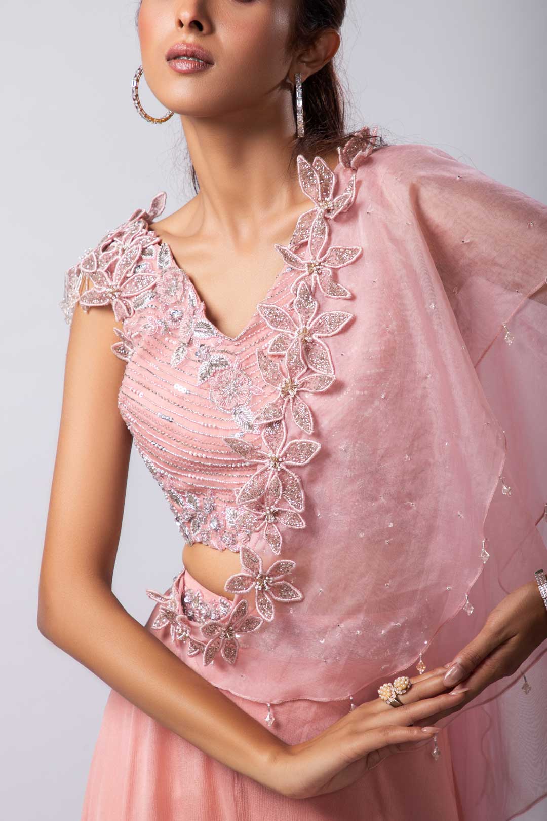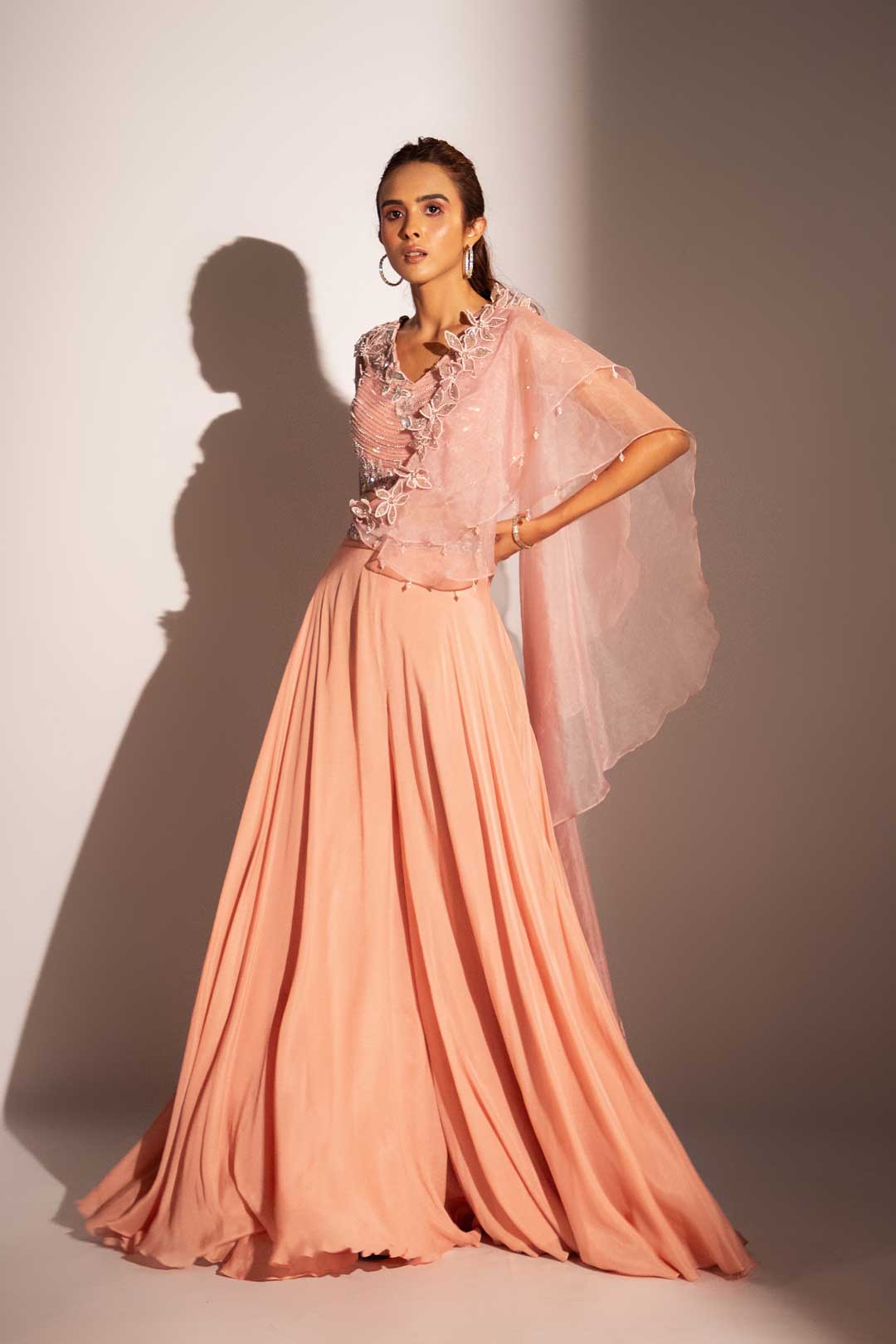 Flowers are often woven into many elements of a garment, creating a romantic aura all around. Unleashing a style with effortless elegance, this set features an embroidered blouse, flared pants with attached palla in an all encompassing peach with silver hand work.